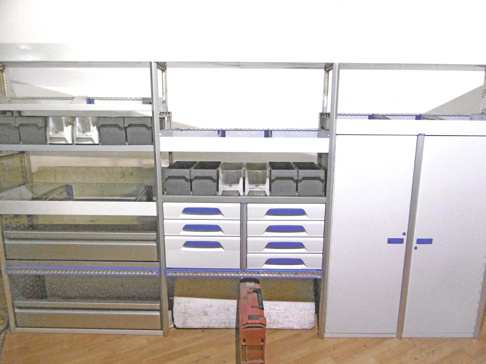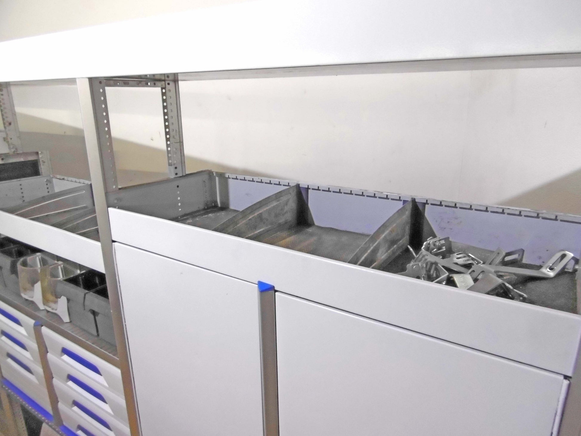 Bild 1 (linke Seite): 7 x Schübe, 2 x Schrank mit Tür, div. Ablage-Ebenen, Sortierboxen, oben durchgehende Wanne, unten Klappe bzw. offen