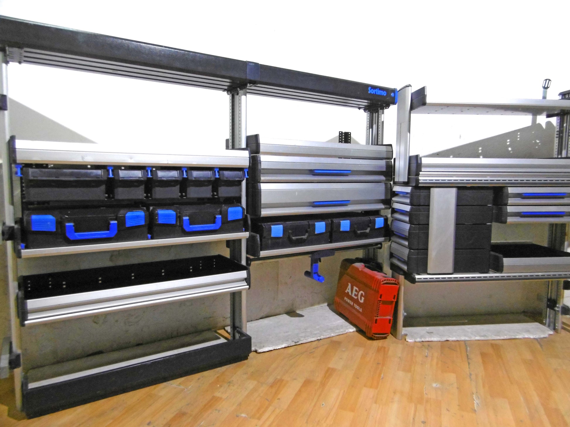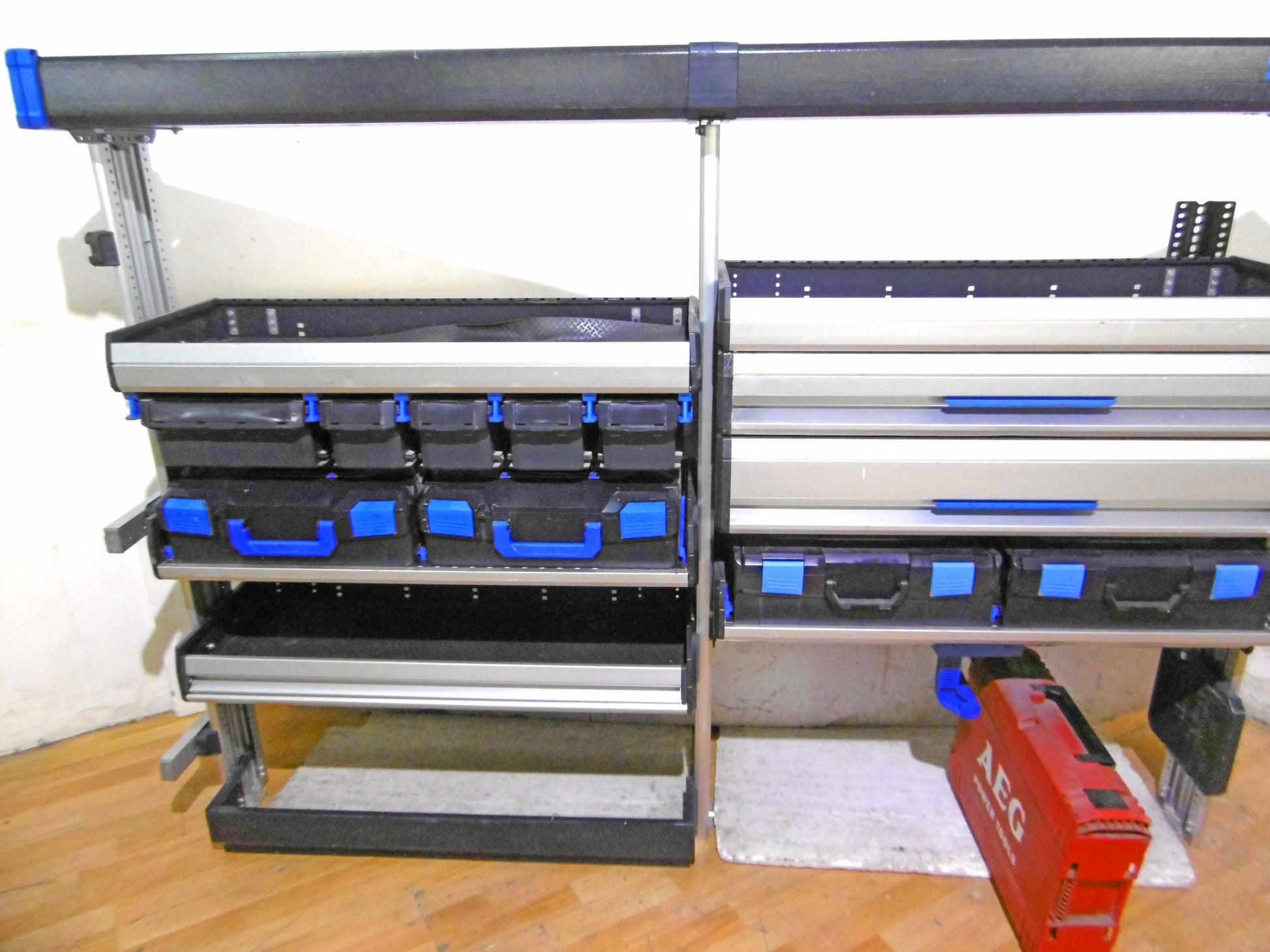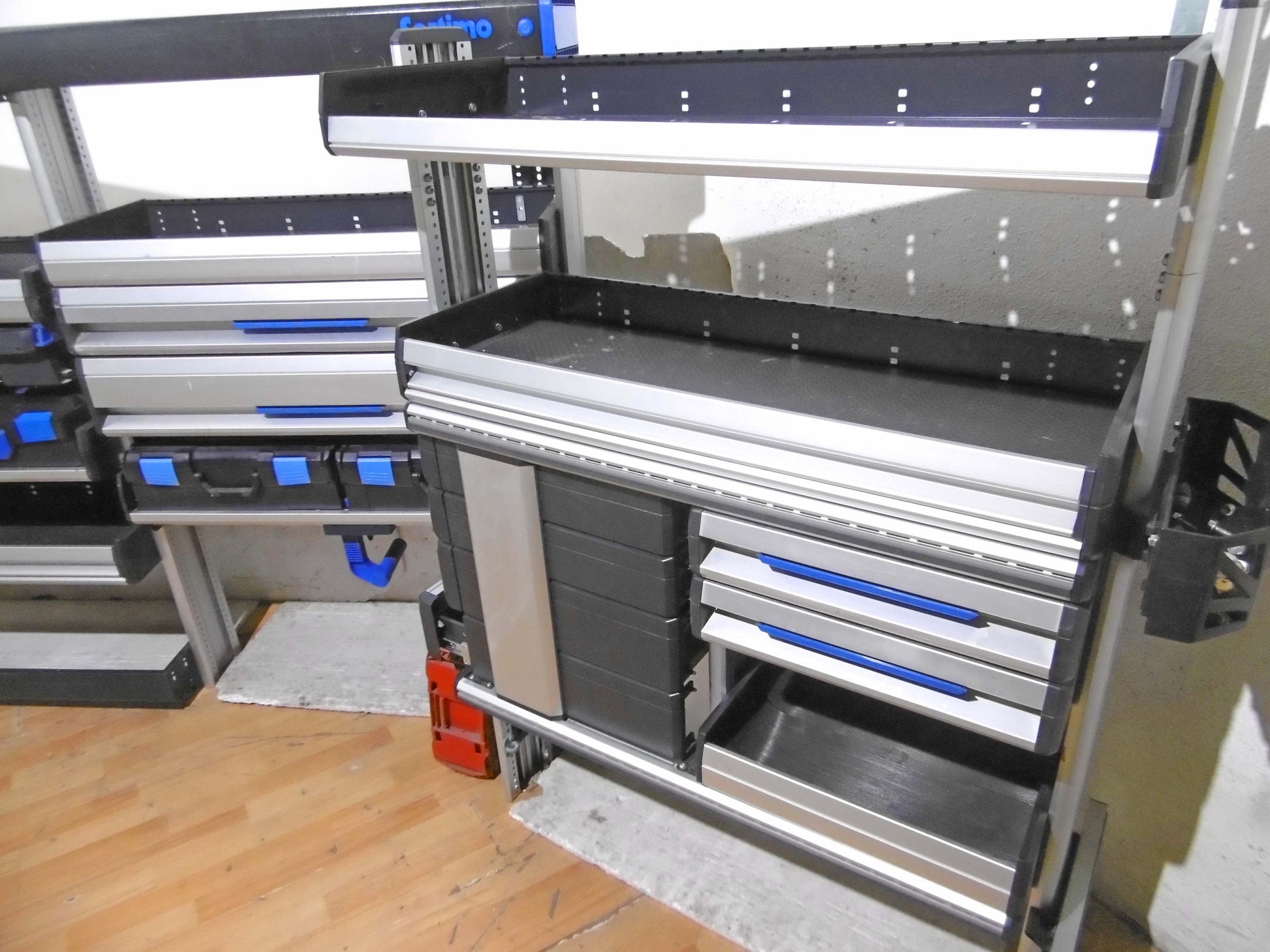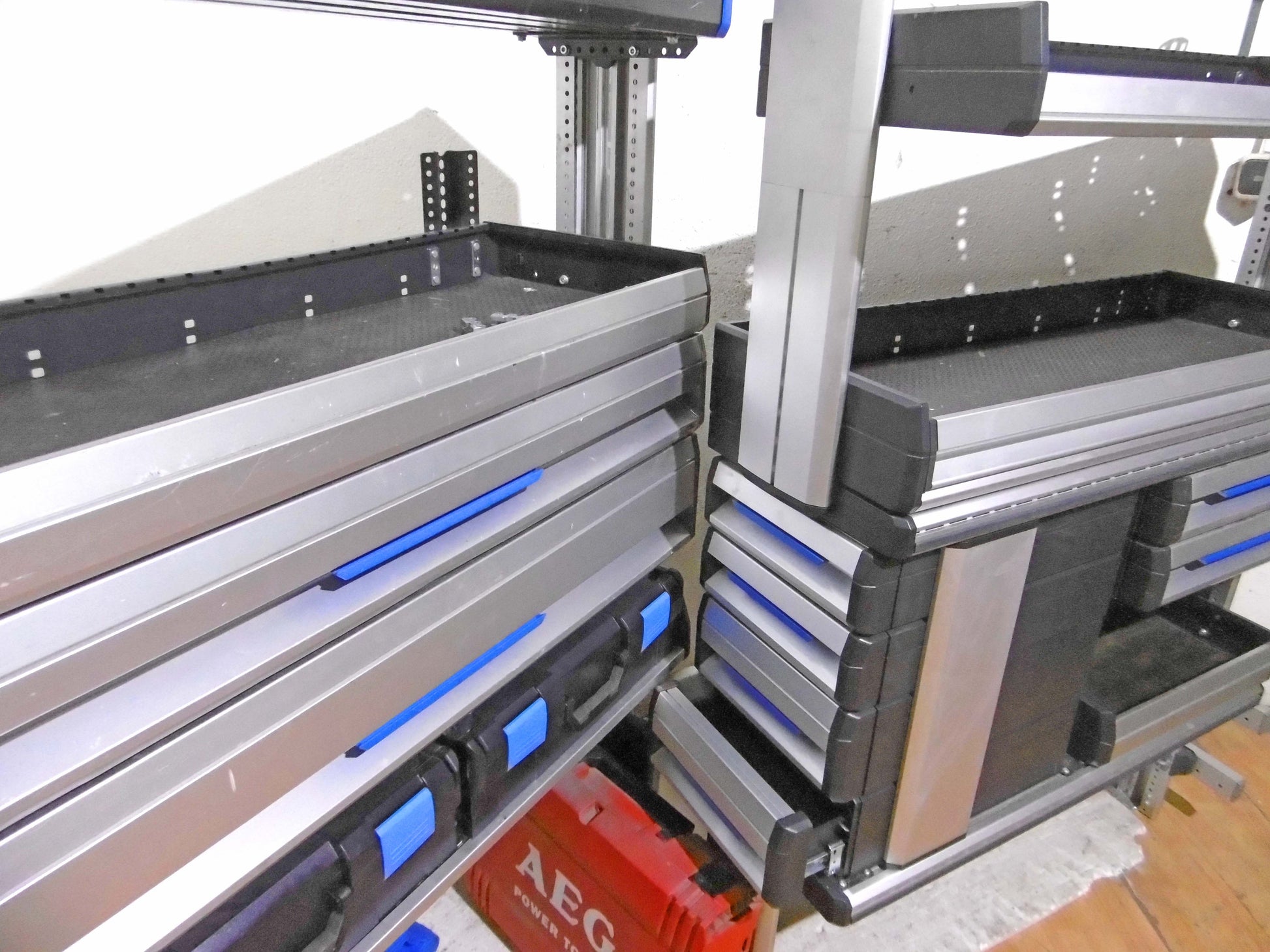 - Bild 1 (rechte Seite): 4 x Schubladen 2 x herausnehmbare Koffer (NEU), div. Sortierboxen, oben durchgehende Wanne, unten offen bzw. mit Feststell-Schieber