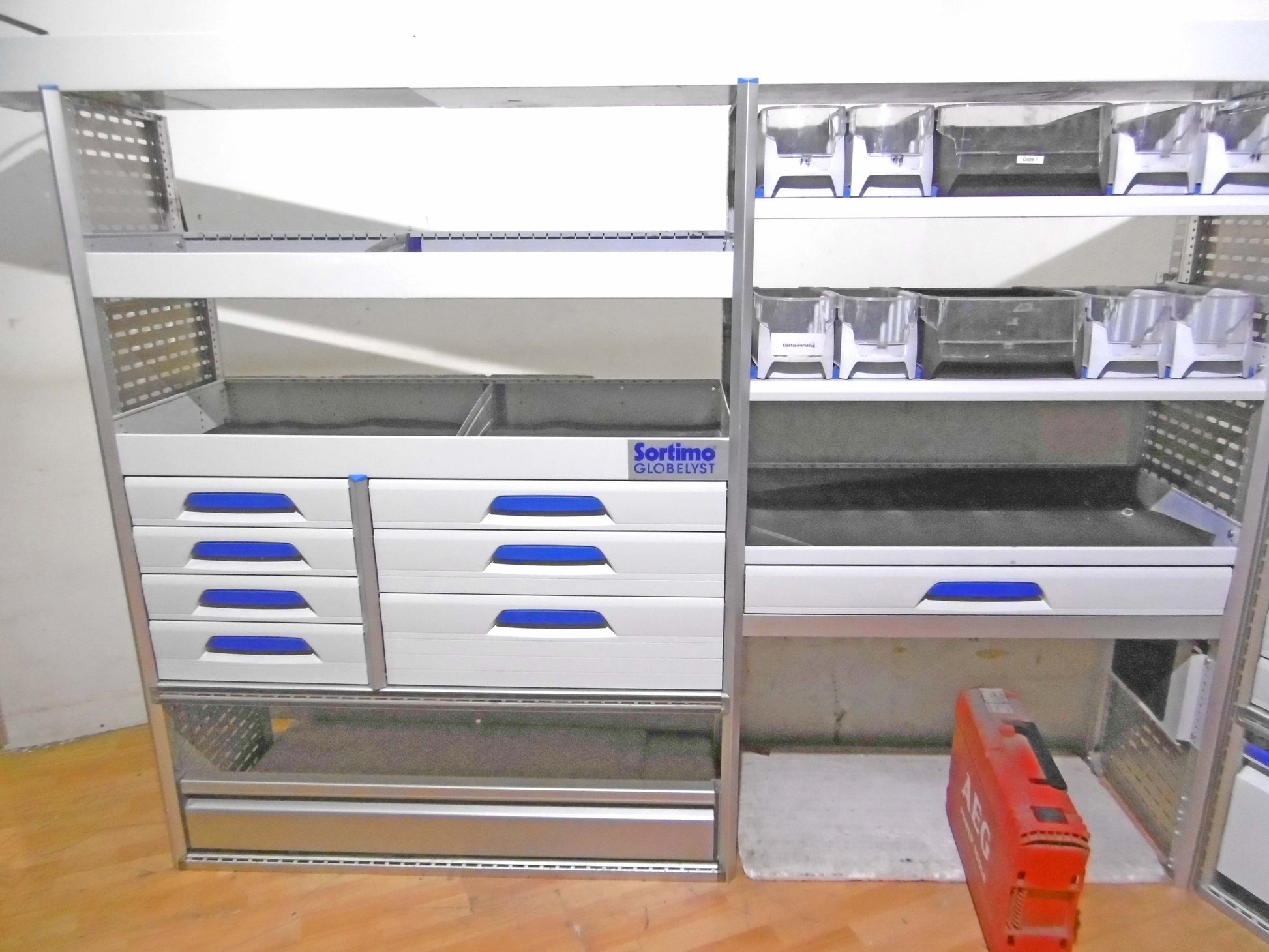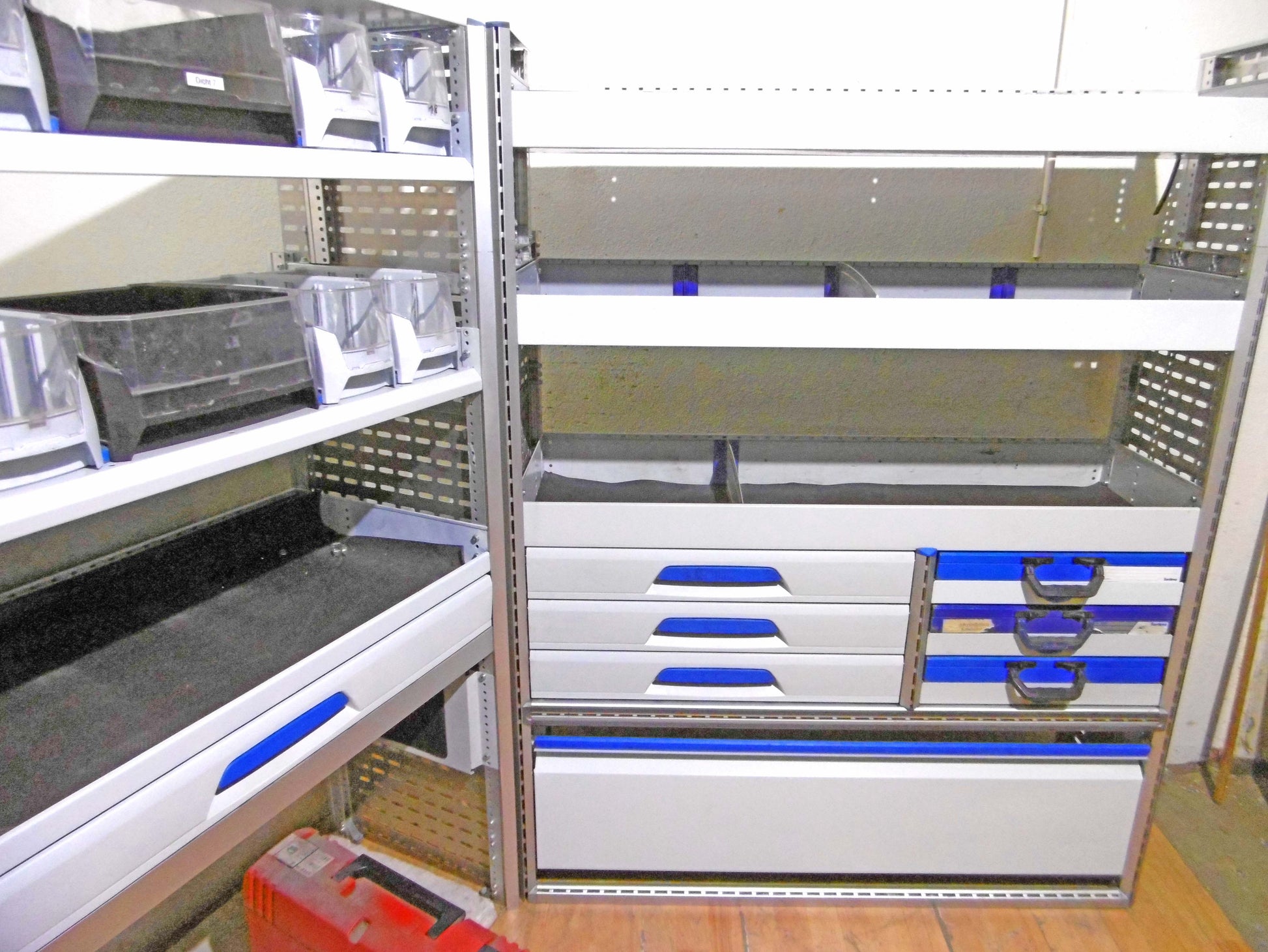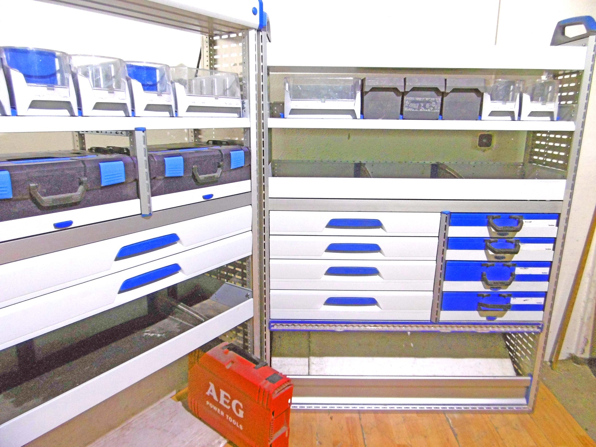 - Bild 1 (linke Seite): 8 x Schübe, div. Ablage-Ebenen/Sortierboxen, oben durchgehende Wanne, unten Klappe bzw. offen