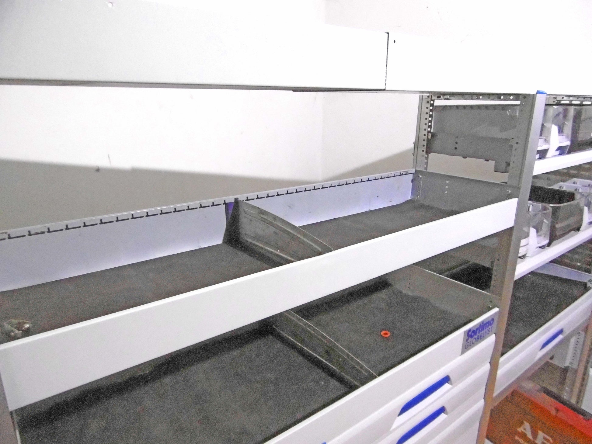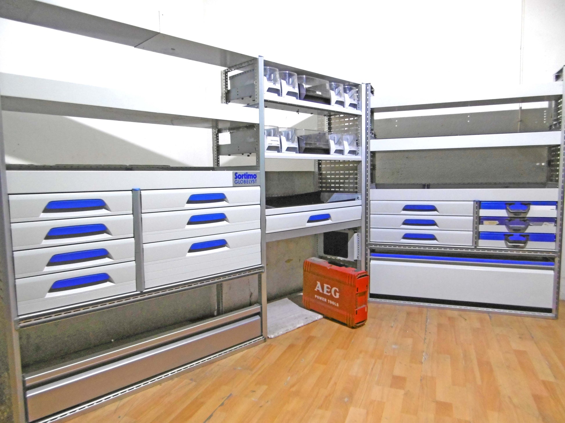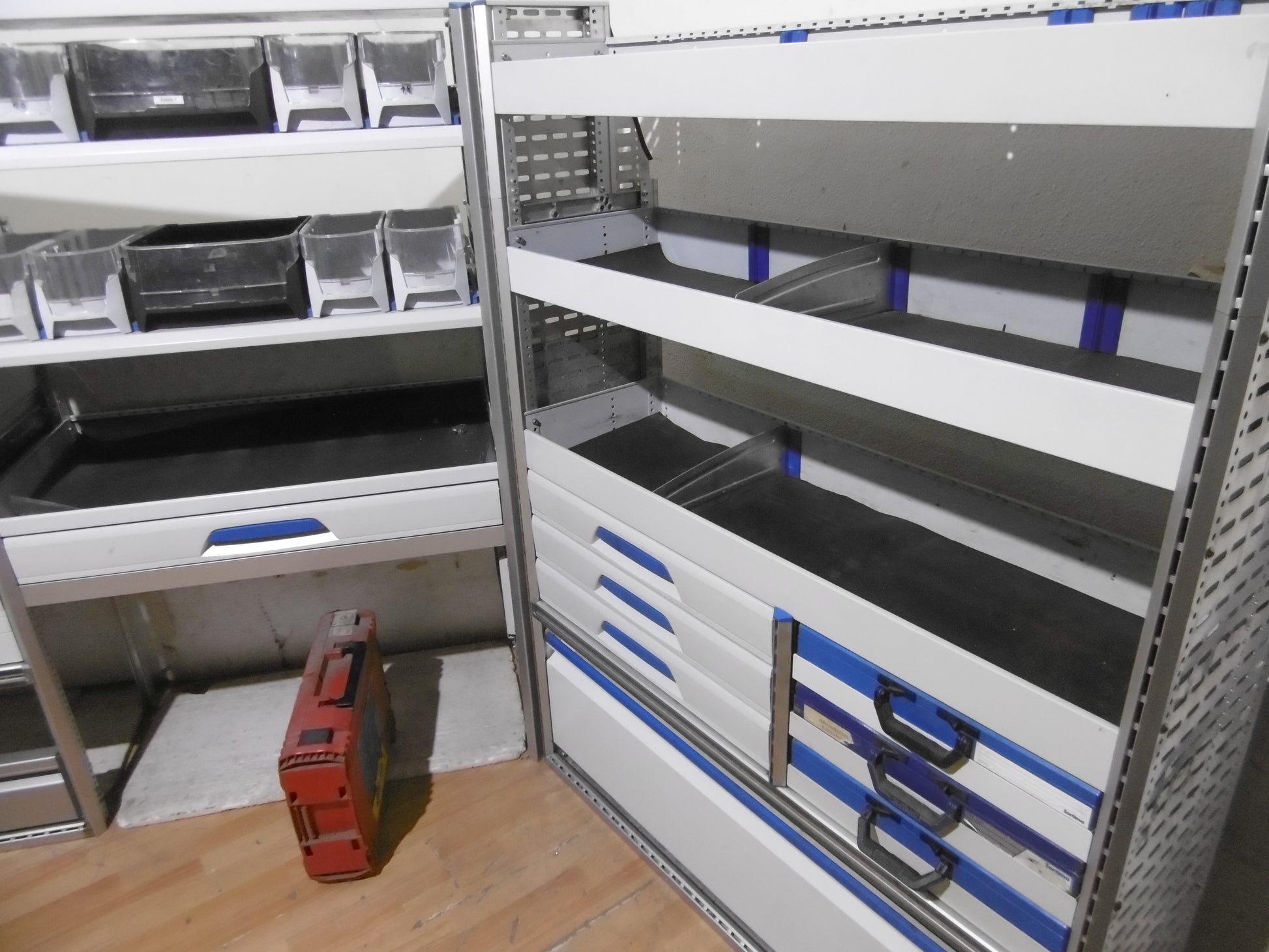 - Bild 1 (linke Seite): 8 x Schübe, div. Ablage-Ebenen/Sortierboxen, oben durchgehende Wanne, unten Klappe bzw. offen