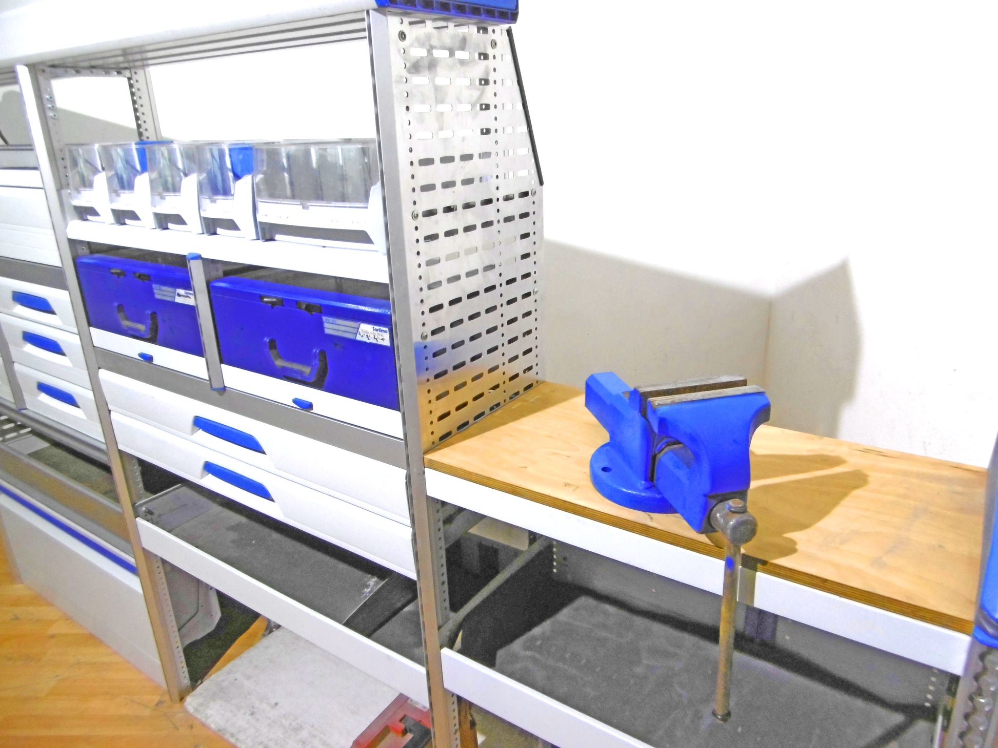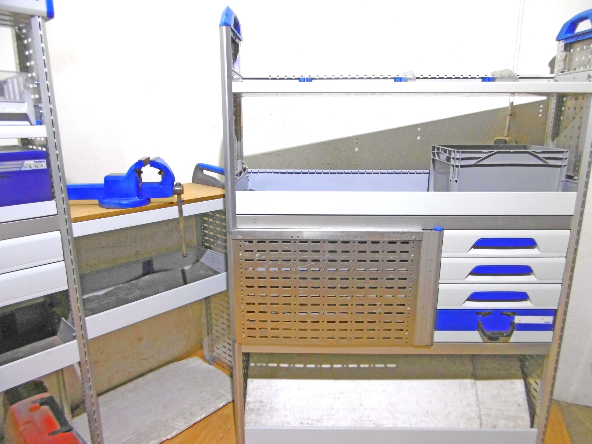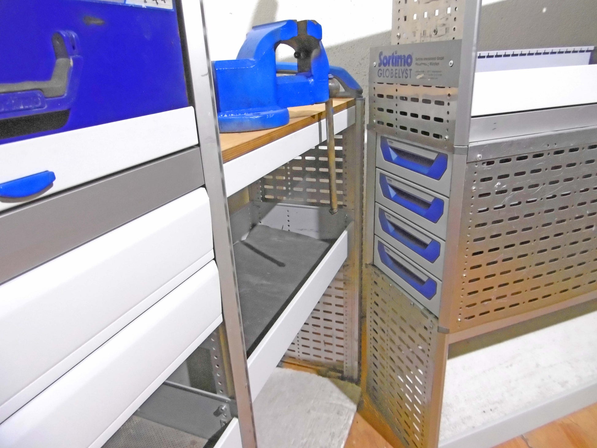 - Bild 1 (linke Seite): 8 x Schübe, div. Ablage-Ebenen/Sortierboxen,Werkbank mit Schraubstock, oben durchgehende Wanne, unten Klappe bzw. offen