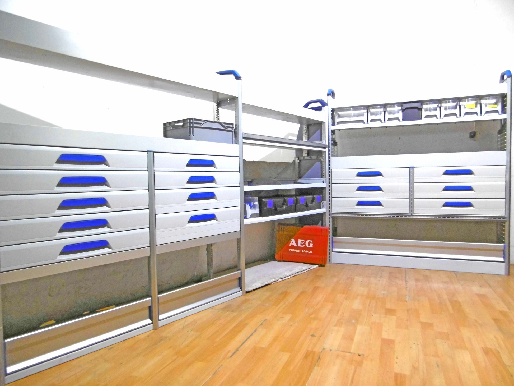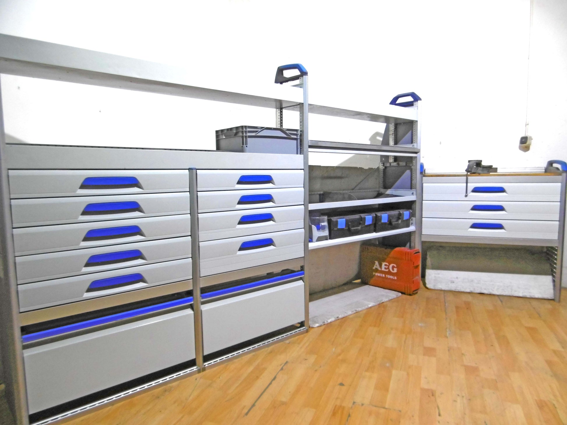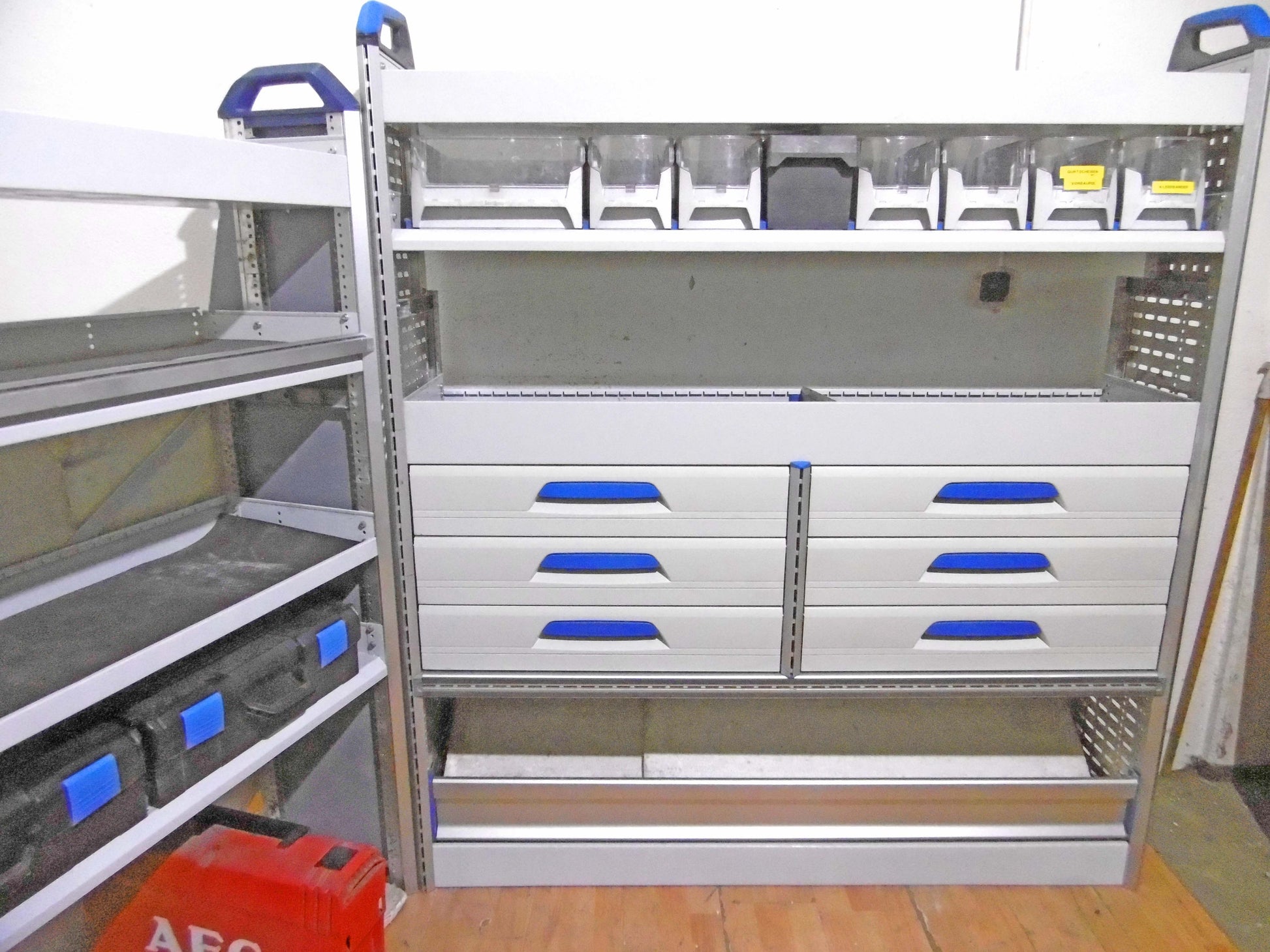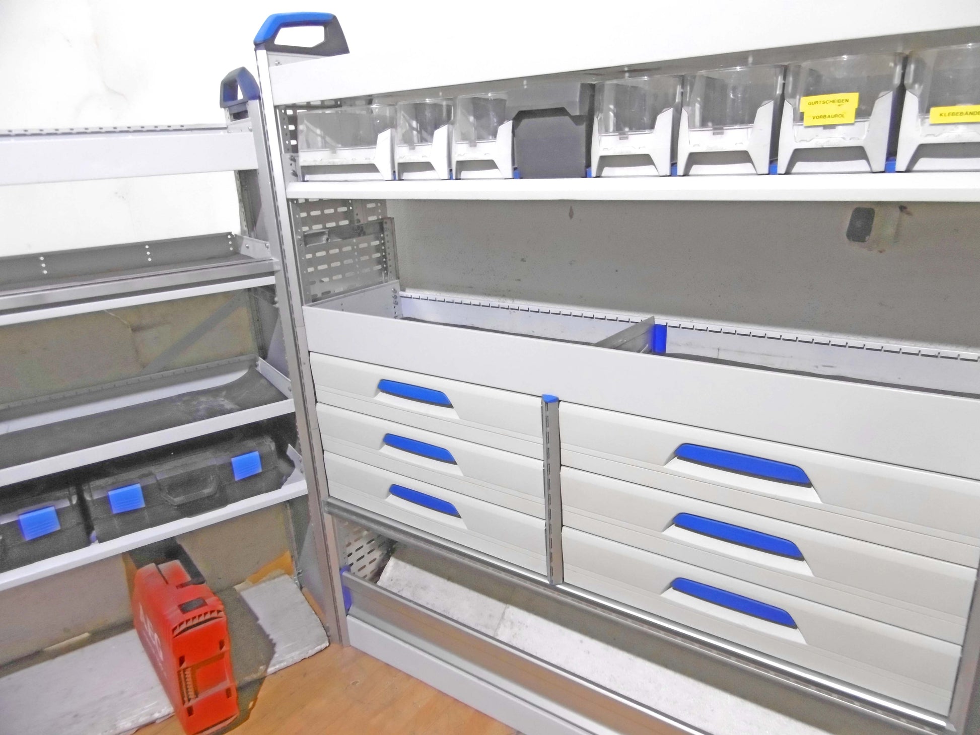 - Bild 1 (linke Seite): 9 x Schublade, 2 x herauanehmbare Koffer (NEU), div. Ablage-Ebenen, Trennbleche/Sortierboxen, unten Klappe bzw. offen