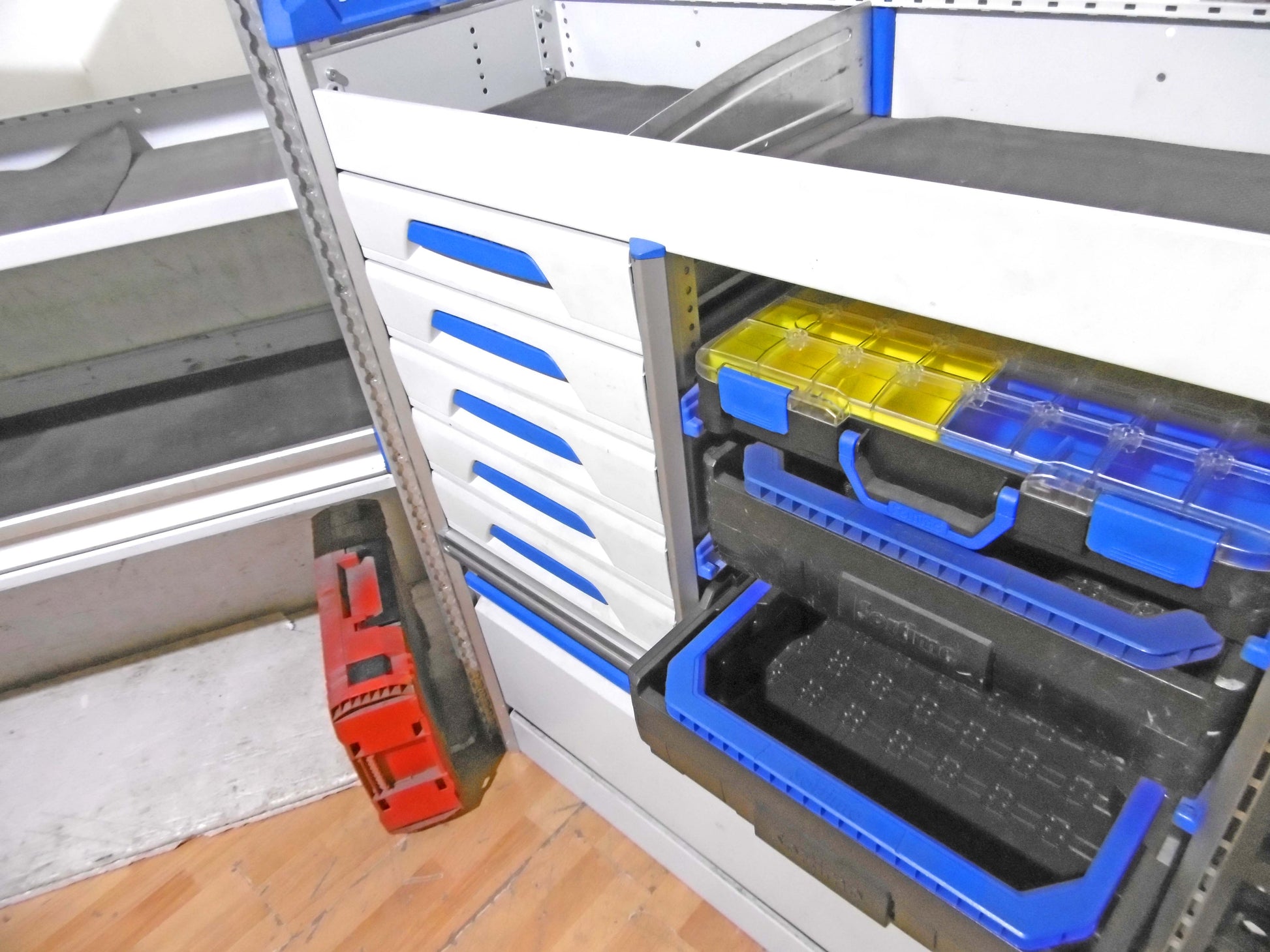 - Bild 1 (linke Seite): 6 x Schübe, div. Sortierboxen, div. Ablage-Ebenen/Trennbleche, oben durchgehende Wanne, unten Klappen bzw. offen