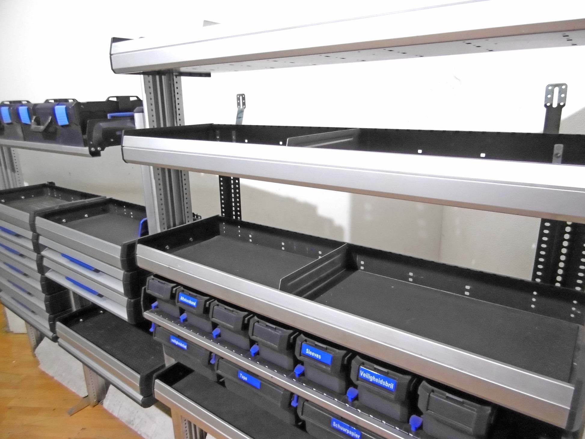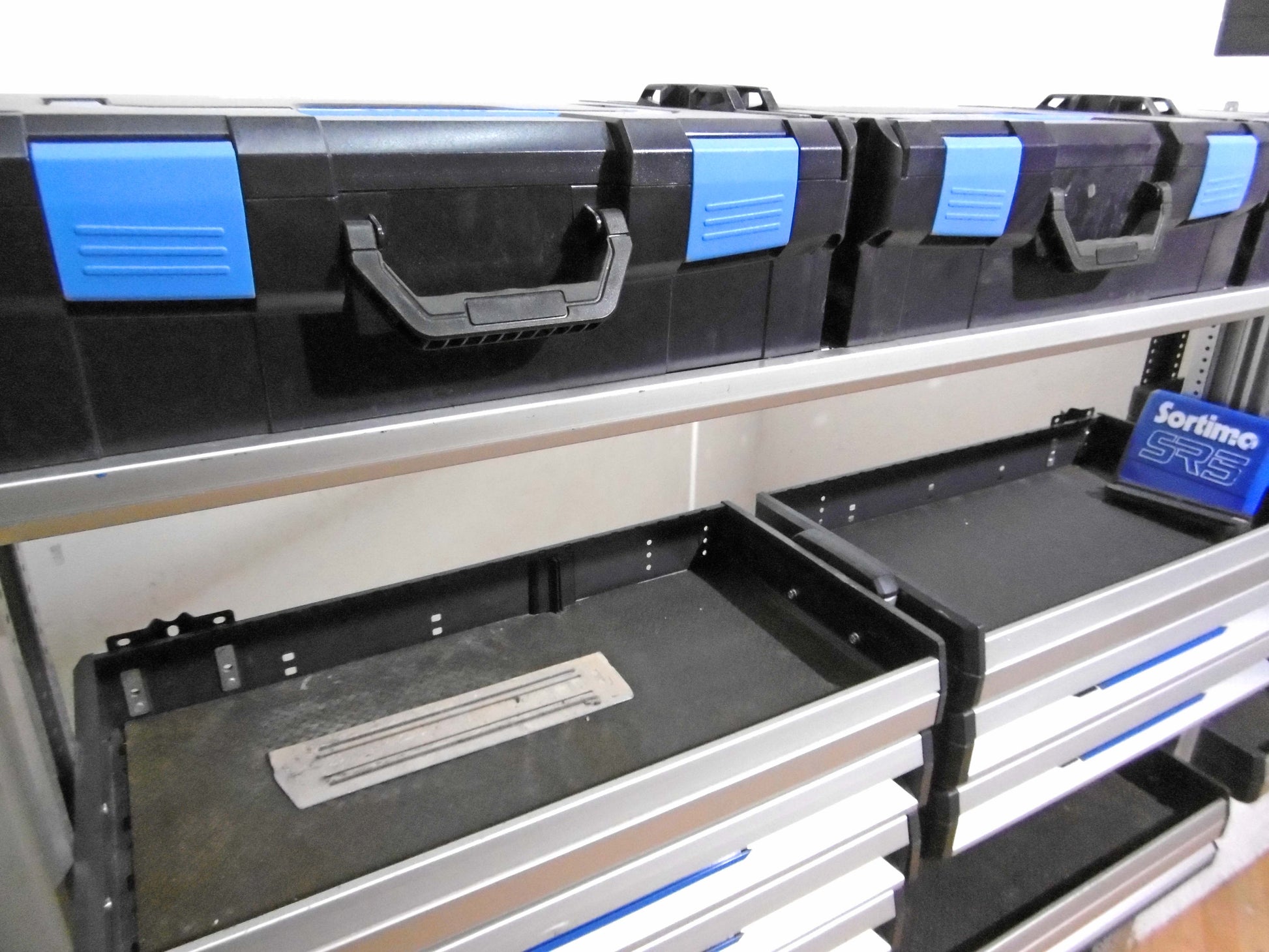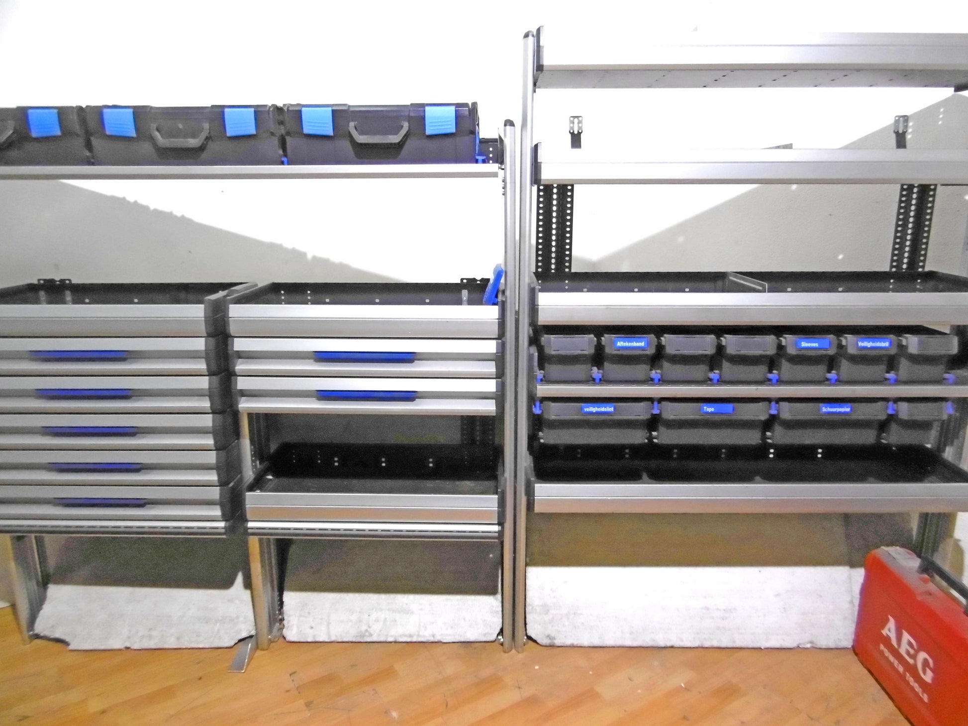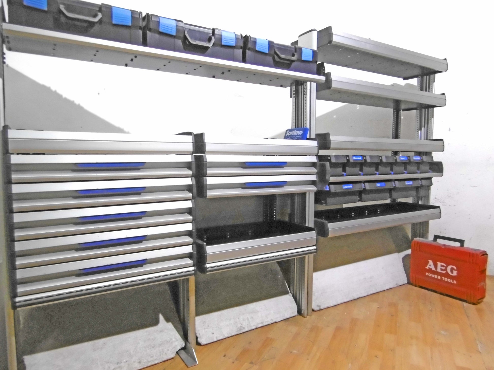 - Bild 1 (linke Seite): 7 x Schübe, 3 x herausnehmbare Koffer (NEU), div. Ablage-Ebenen/Sortierboxe, unten offen