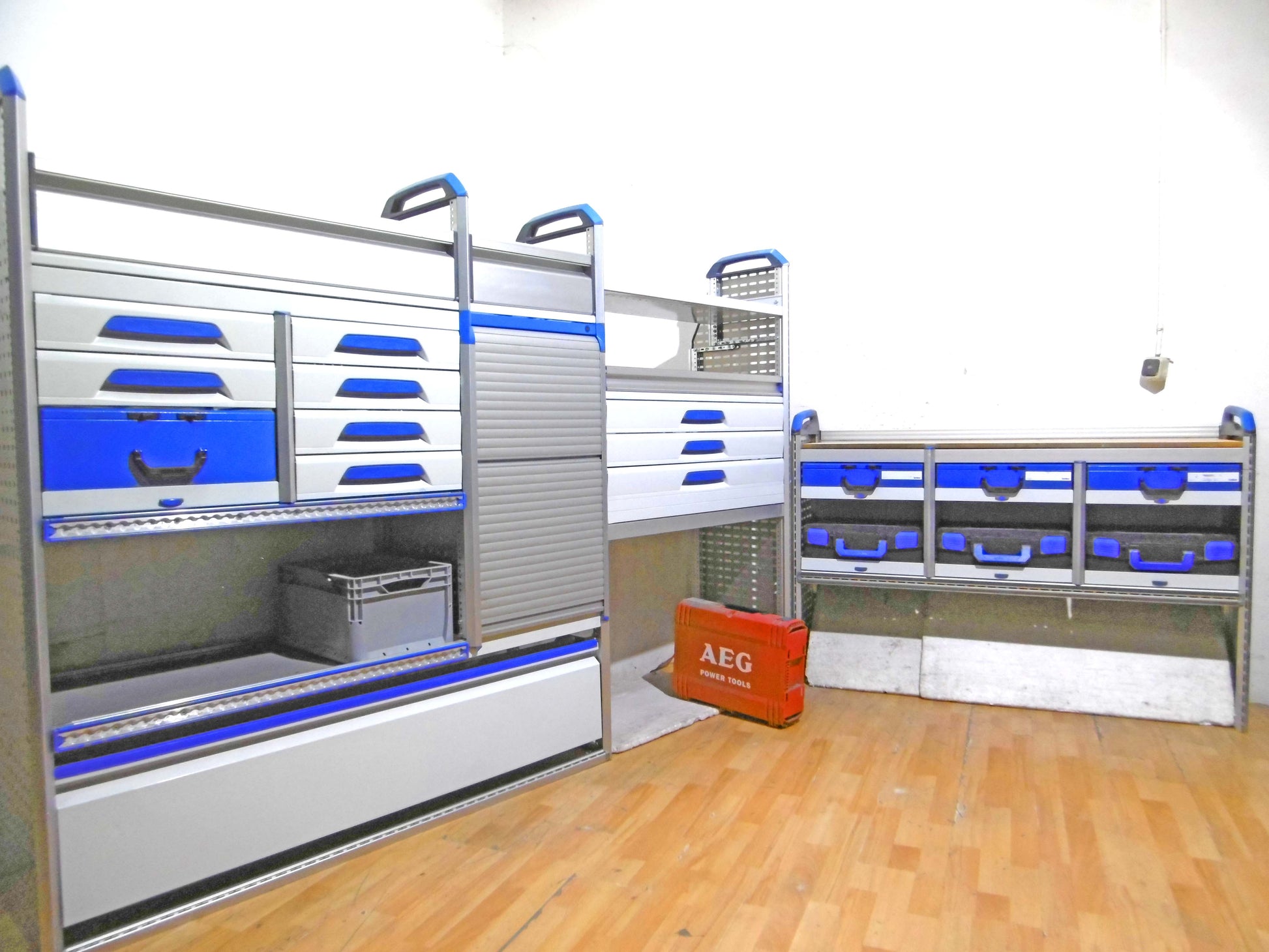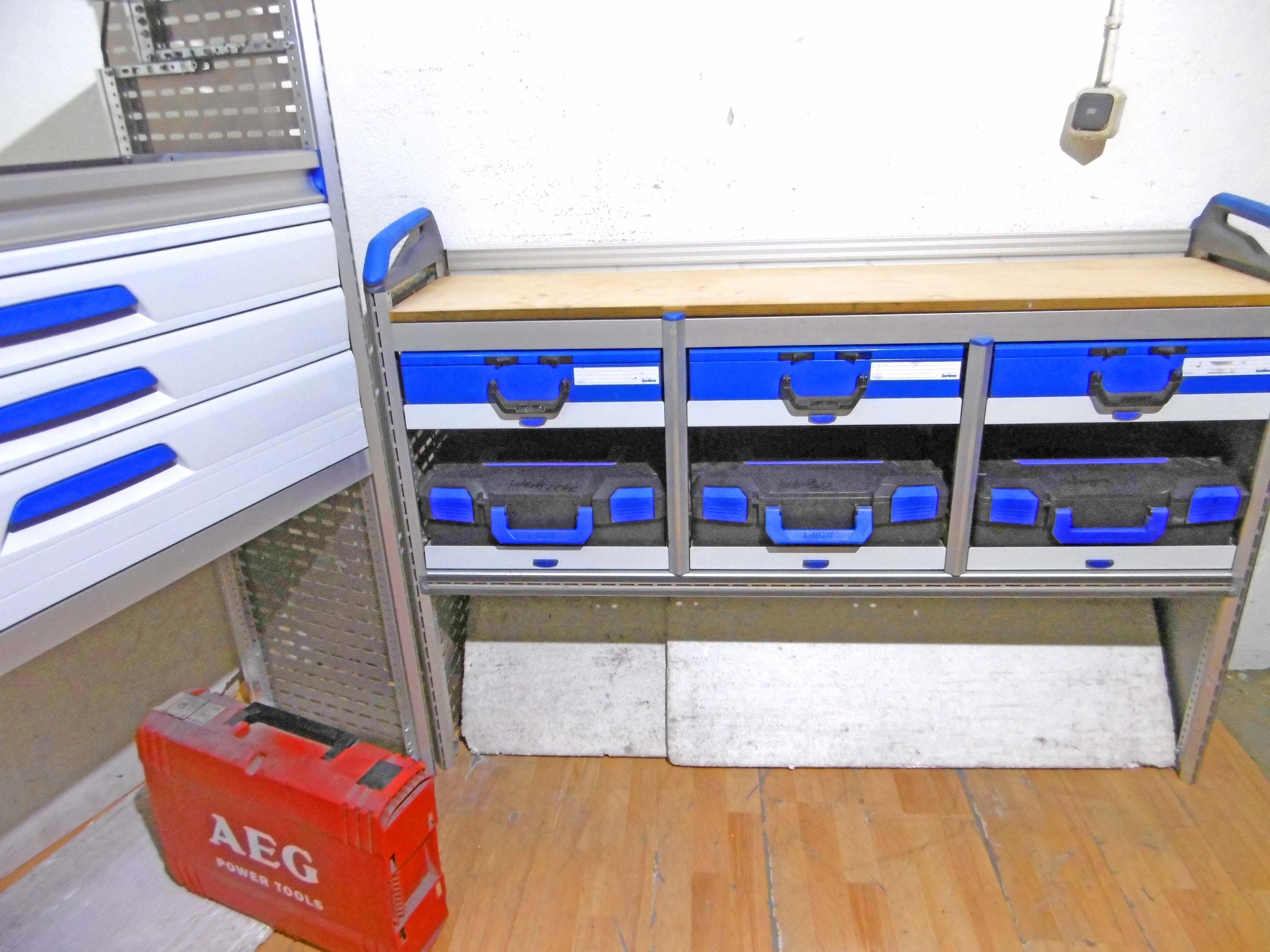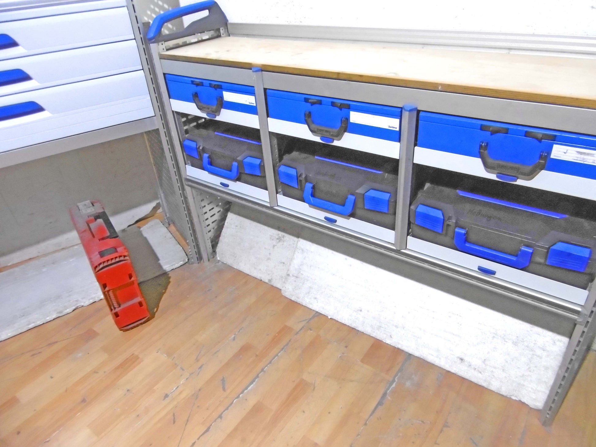 - Bild 1 (rechte Seite): 6 x herausnehmbare Koffer, oben Werkbank ohne Schraubstock, unten offen