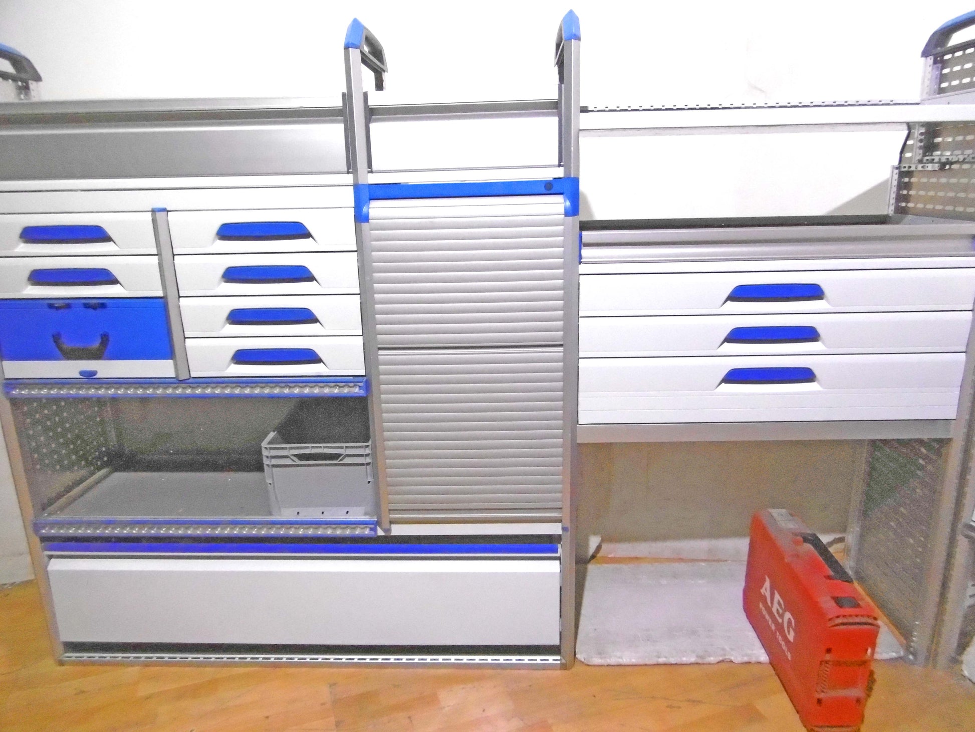 - Bild 1 (linke Seite): 9 x Schübe, 1 x herausnehmbarer Koffer, div. Sortierboxen, div. Ablage-Ebenen/Trennbleche, 1 x Roll-Schrank, unten Klappe bzw. offen