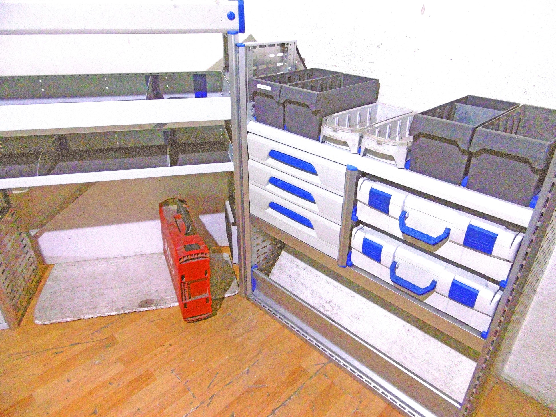 - Bild 1 (linke Seite): 2 x herausnehmbare Koffer, div. Sortierboxen, oben durchgehende Wanne, unten Klappe bzw. offen
