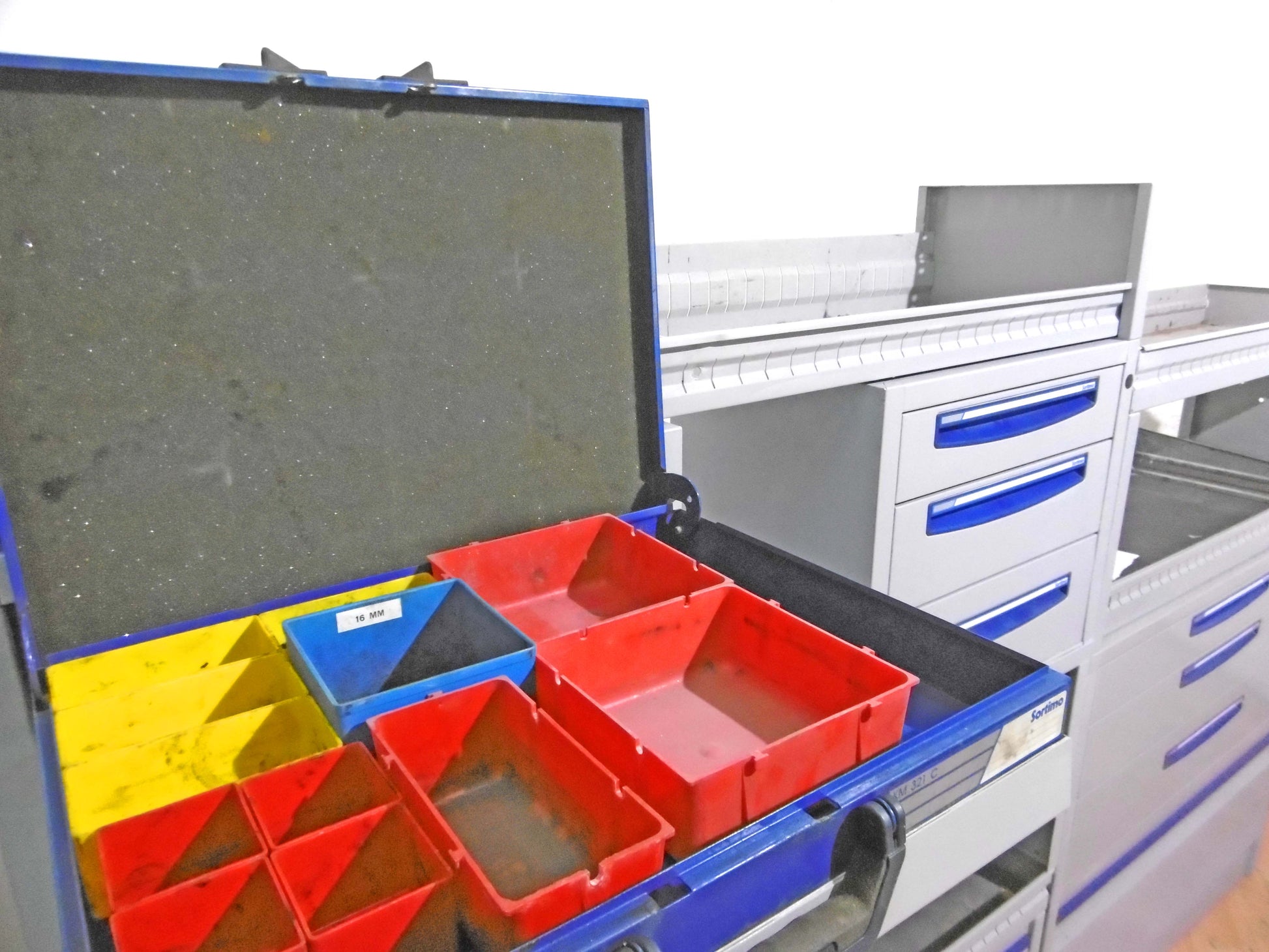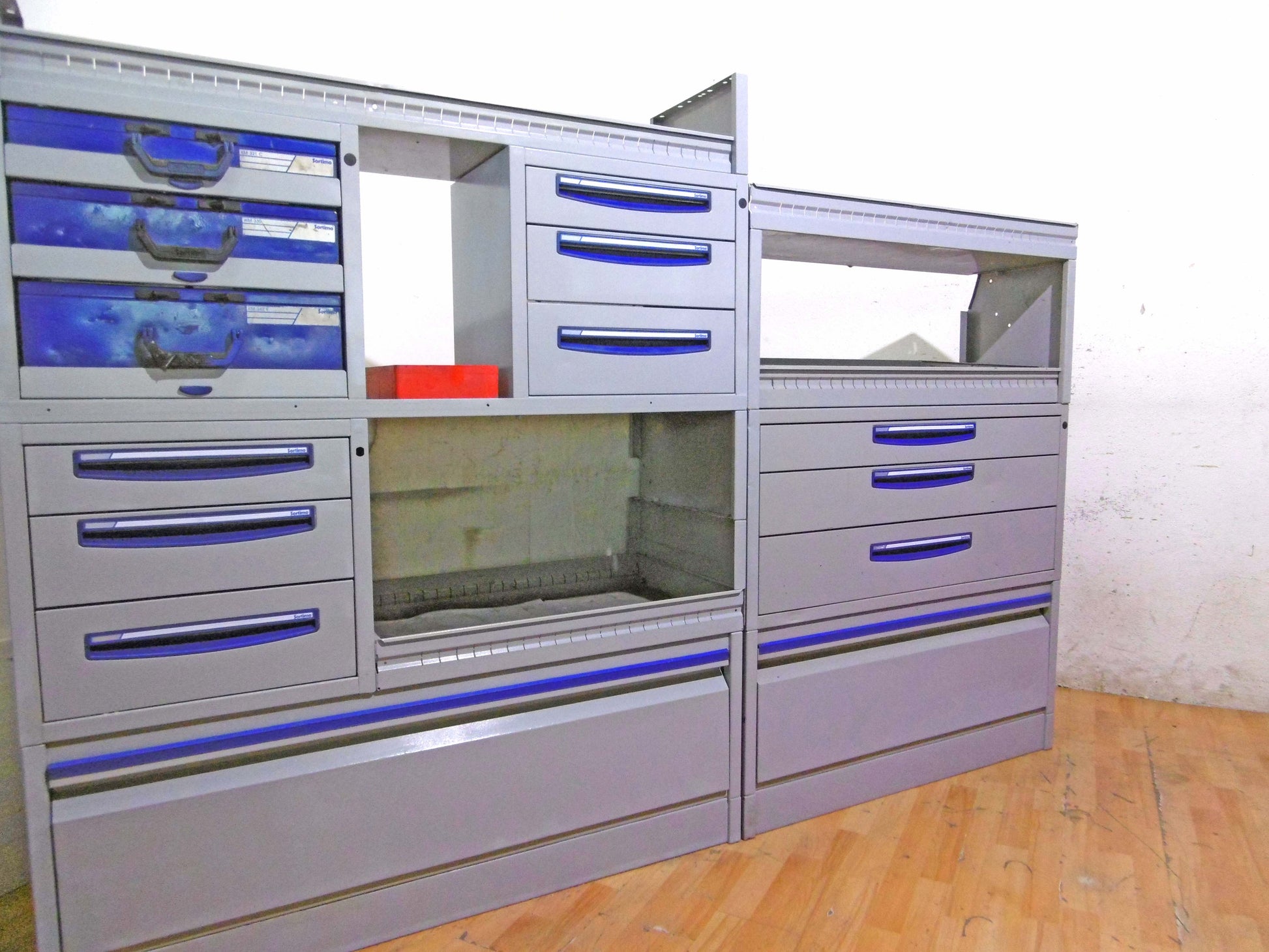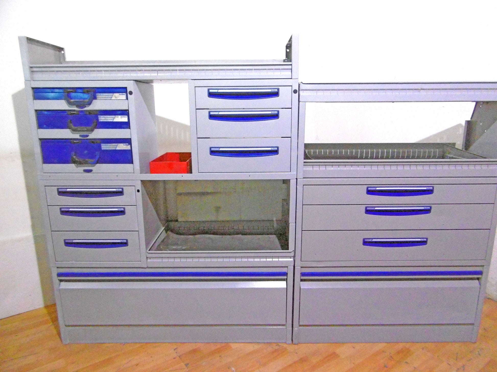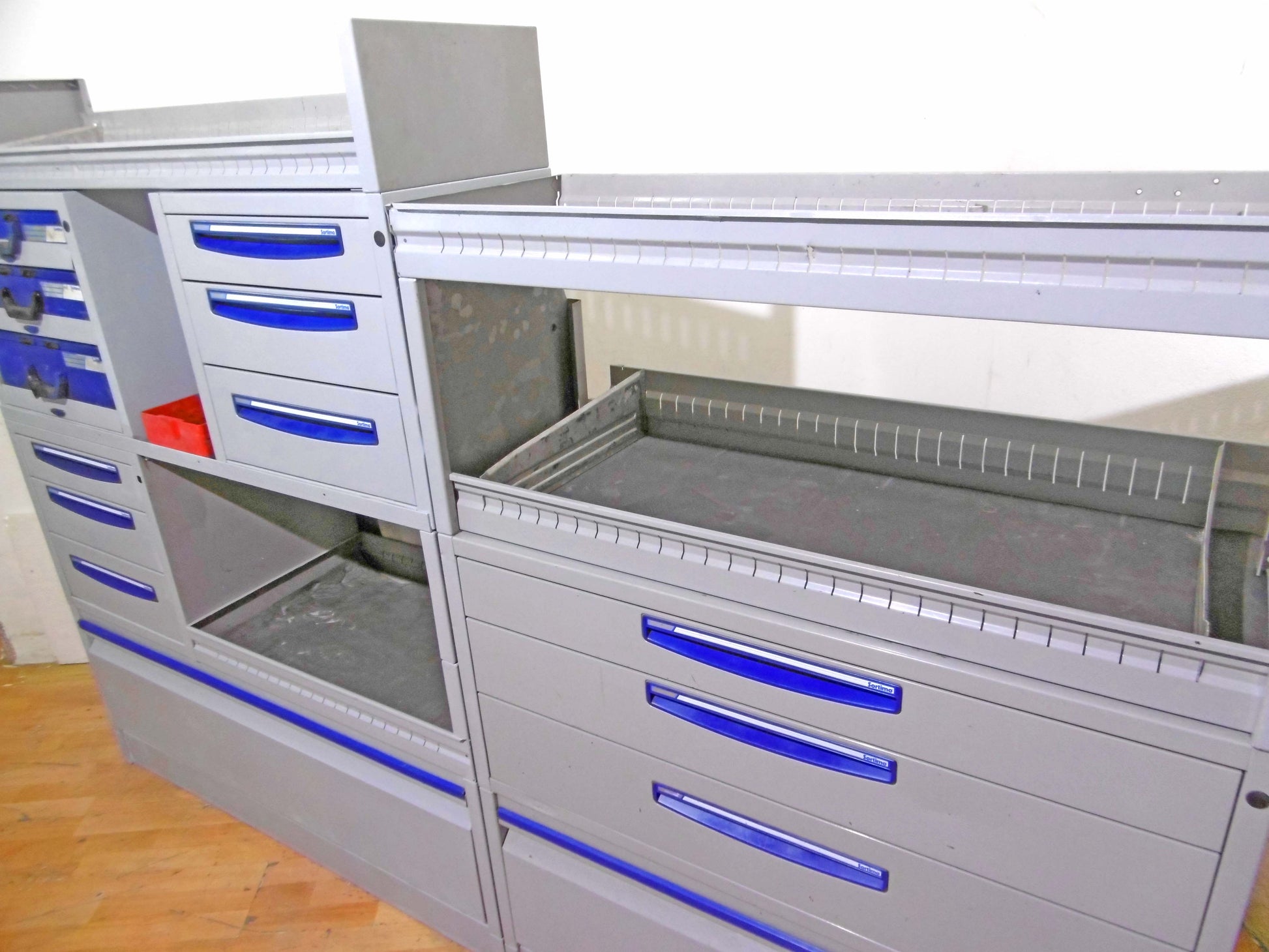 - Bild 1 (linke Seite): 9 x Schübe, div. Ablage-Ebenen, Sortierboxen, unten Klappen