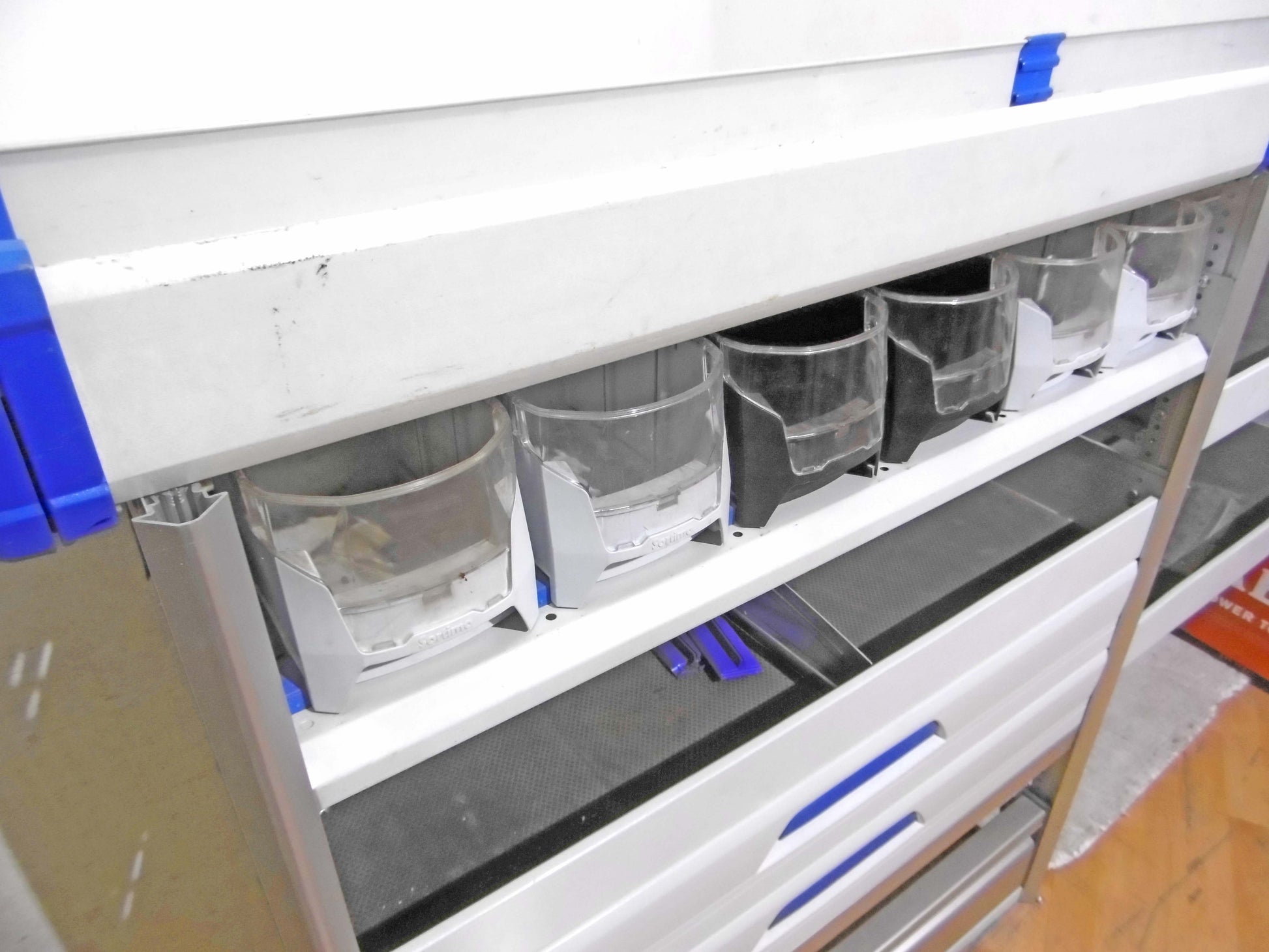 - Bild 1 (linke Seite): 2 x Schübe, div. Ablage-Ebenen/Trennbleche/ Sortierboxen, oben durchgehende Wanne, unten Klappe bzw. offen
