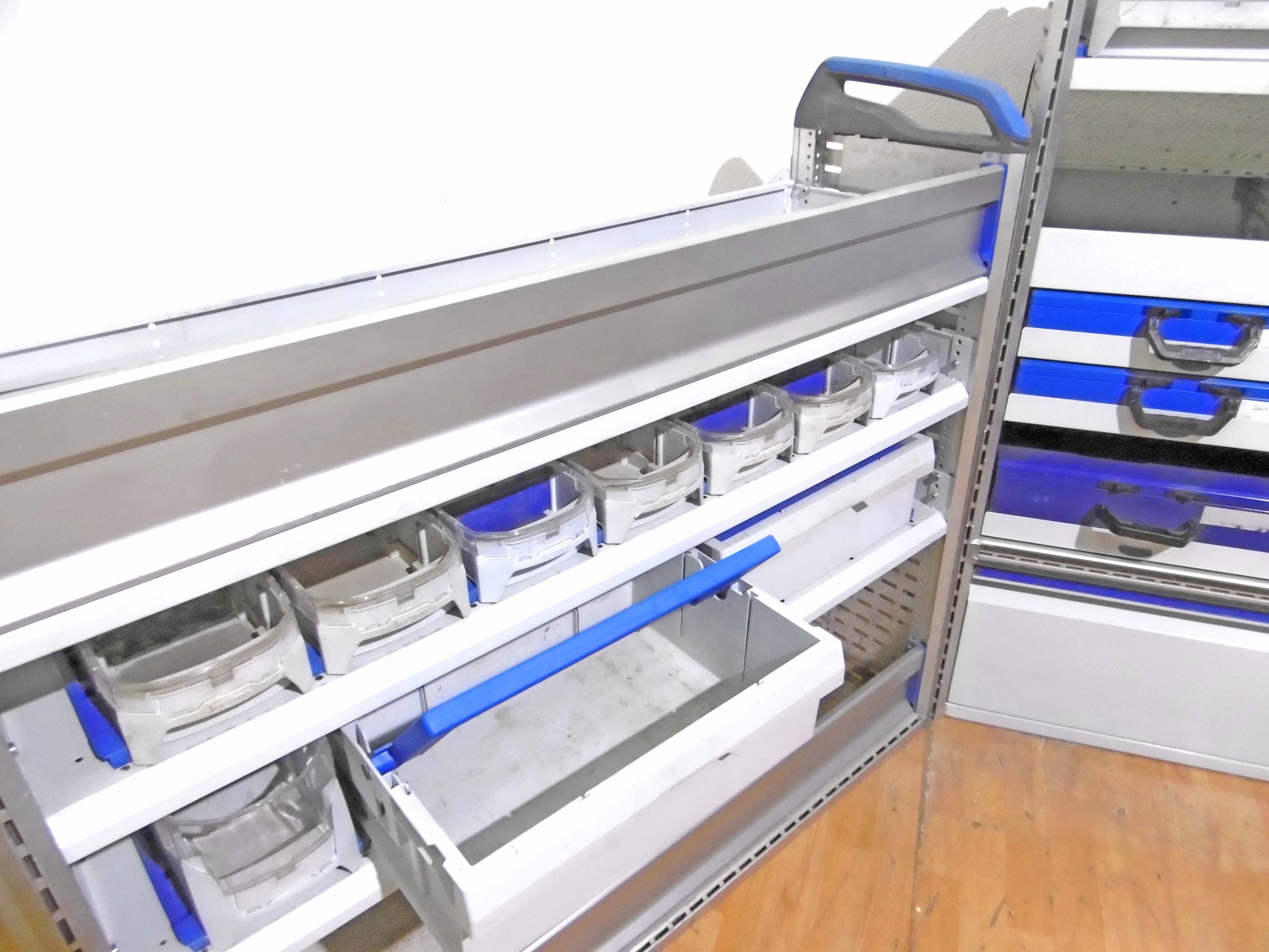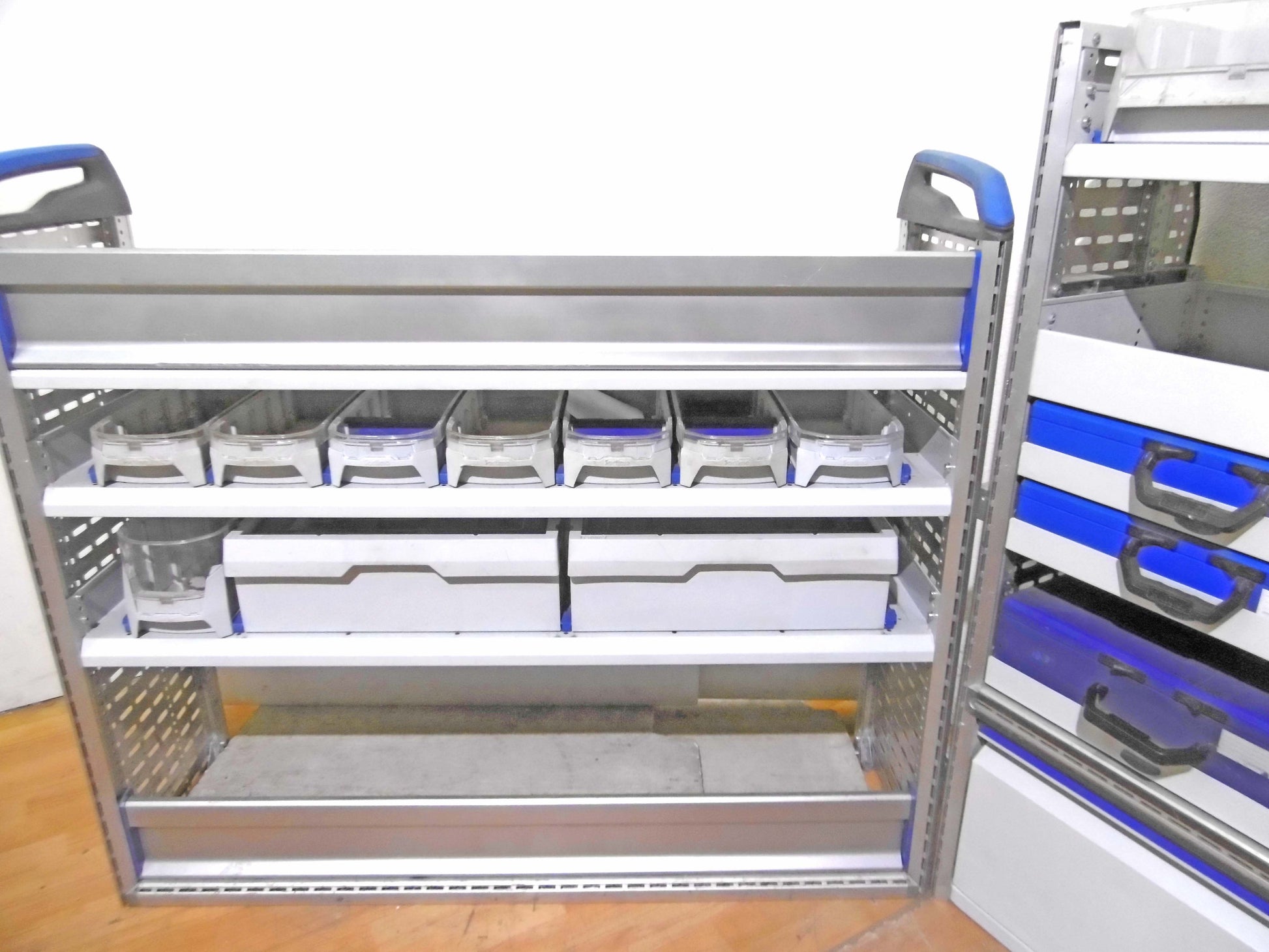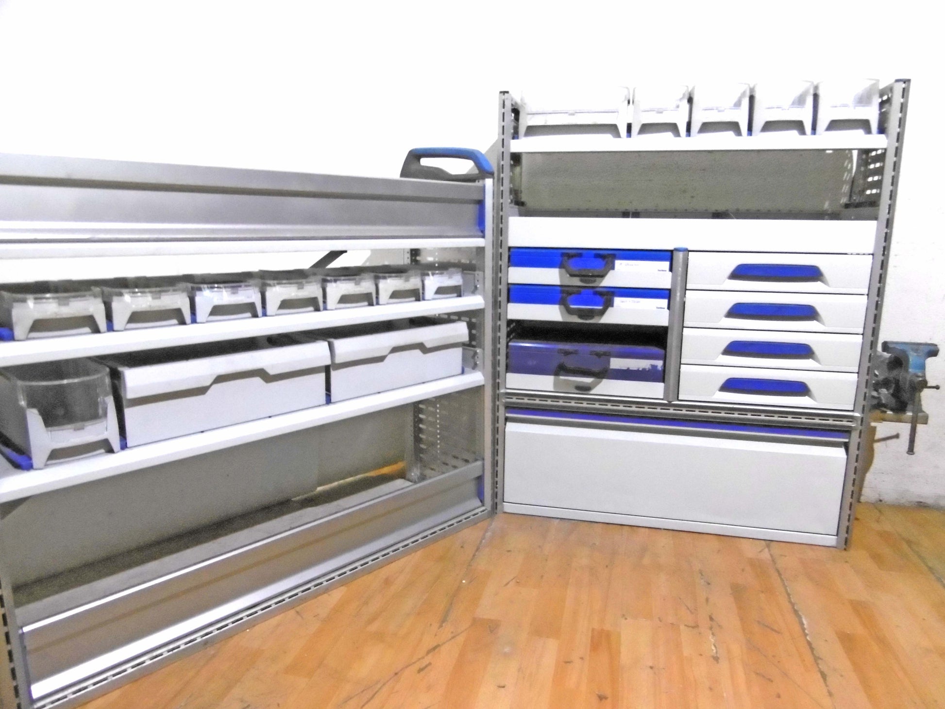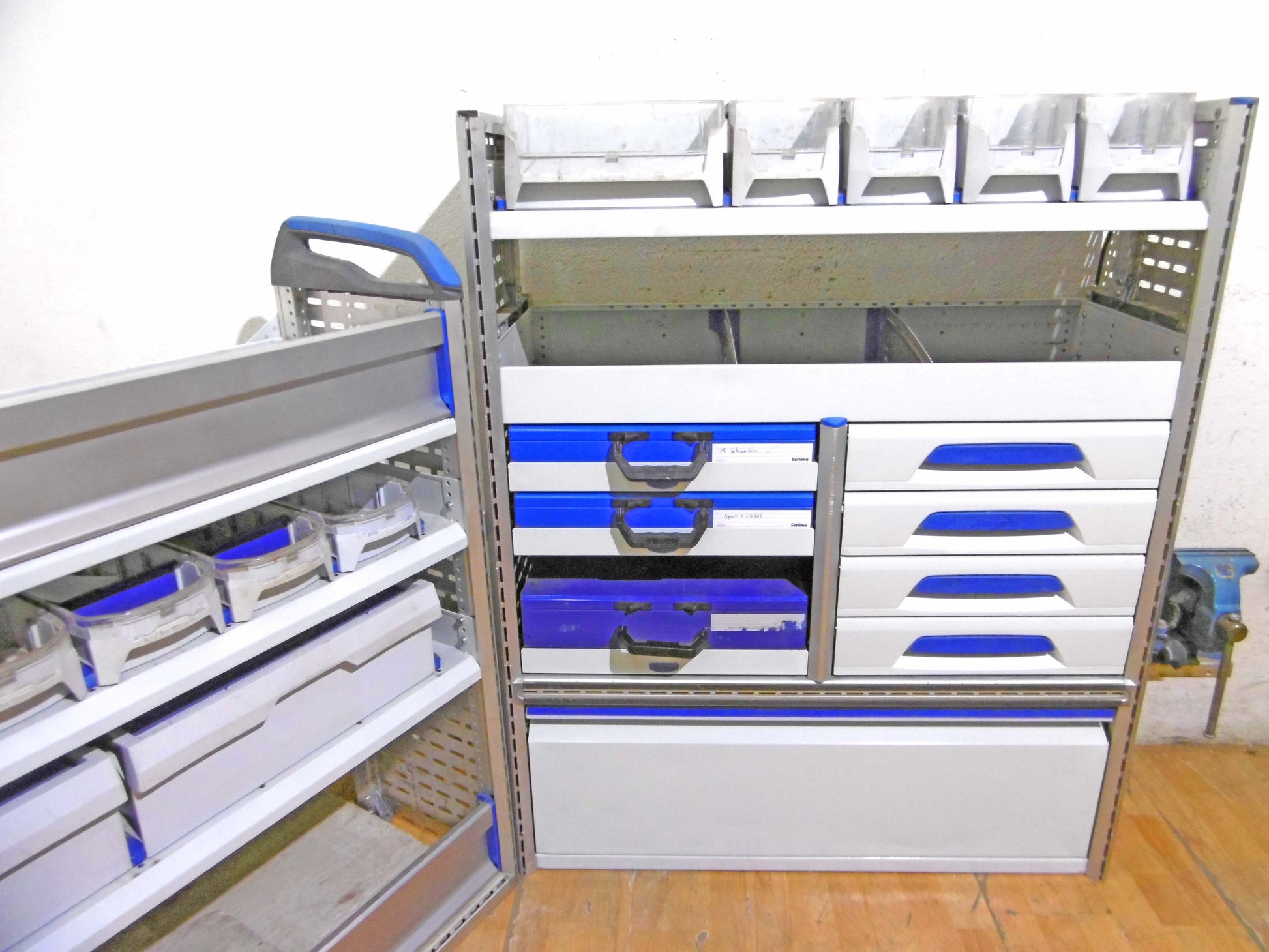 - Bild 1 (rechte Seite): 4 x Schübe, 3 x herausnehmbare Koffer, Ablage-Ebenen/Sortierboxen, herausziehbare Werkbank mit Schraubstock, unten Klappe