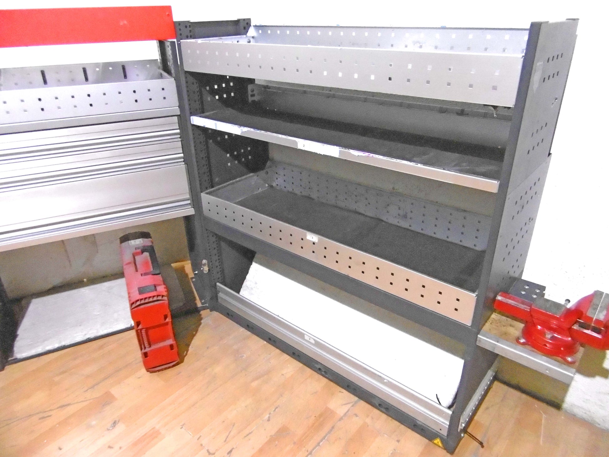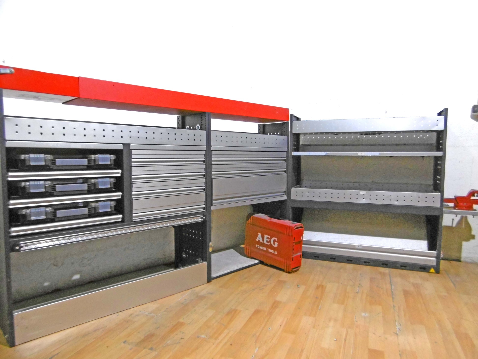 - Bild 1 (rechte Seite): div. Ablage-Ebenen, herausziehbare Werkbank mit Schraubstock, unten Klappe