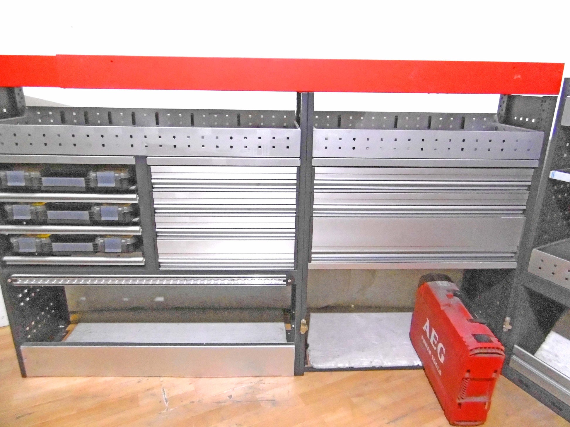 Bild 1 (linke Seite): 7 x Schübe, 3 x herausnehmbare Koffer, div. Ablage-Ebenen/Trennbleche, oben durchgehende Wanne, unten halb-offen bzw. offen