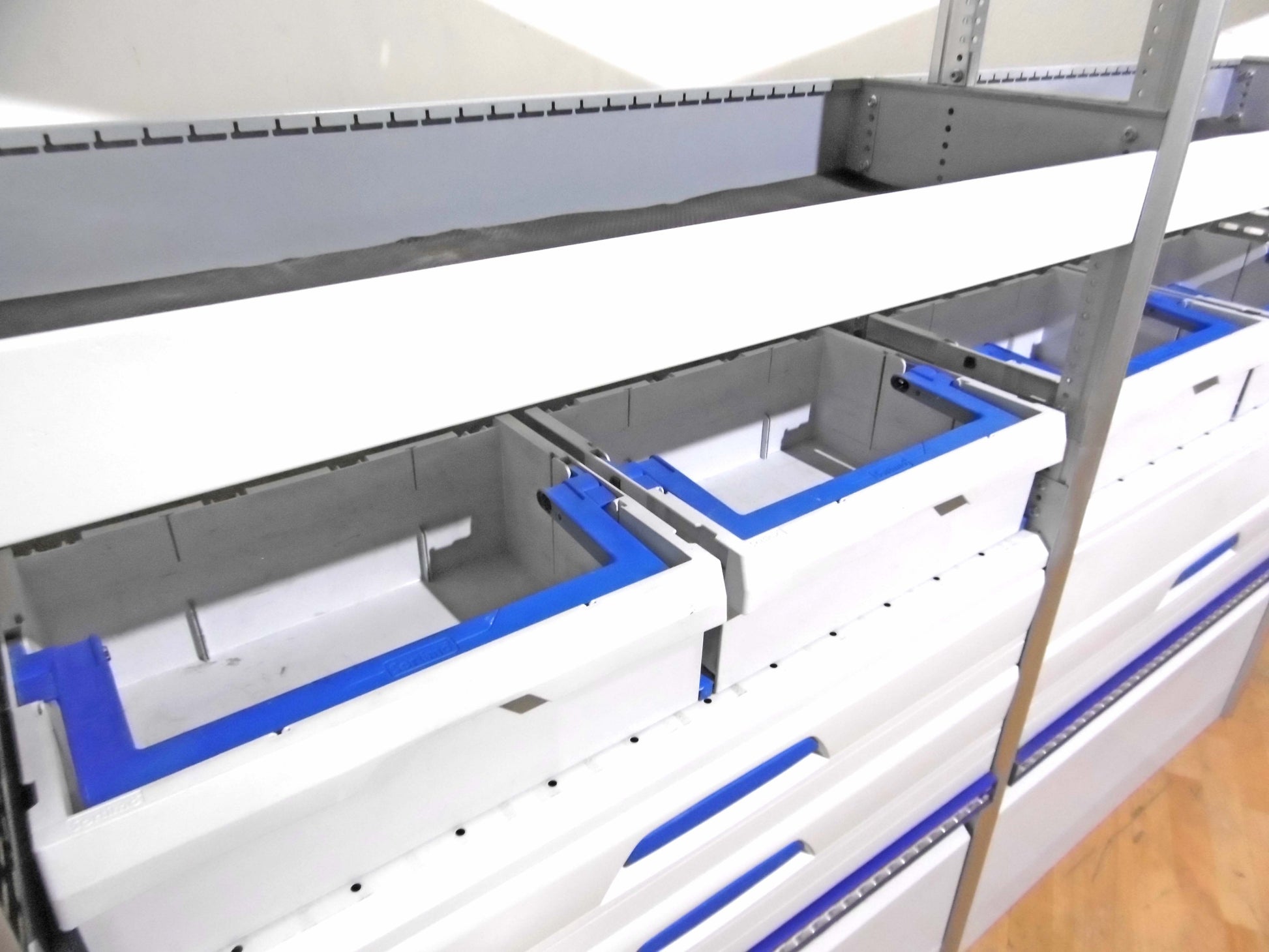 Bild 1 (linke Seite): 3 x Schübe, 4 x herausnehmbare Koffer, div. Ablage-Ebenen, Sortierboxen, oben durchgehende Wanne, unten Klappe bzw. offen
