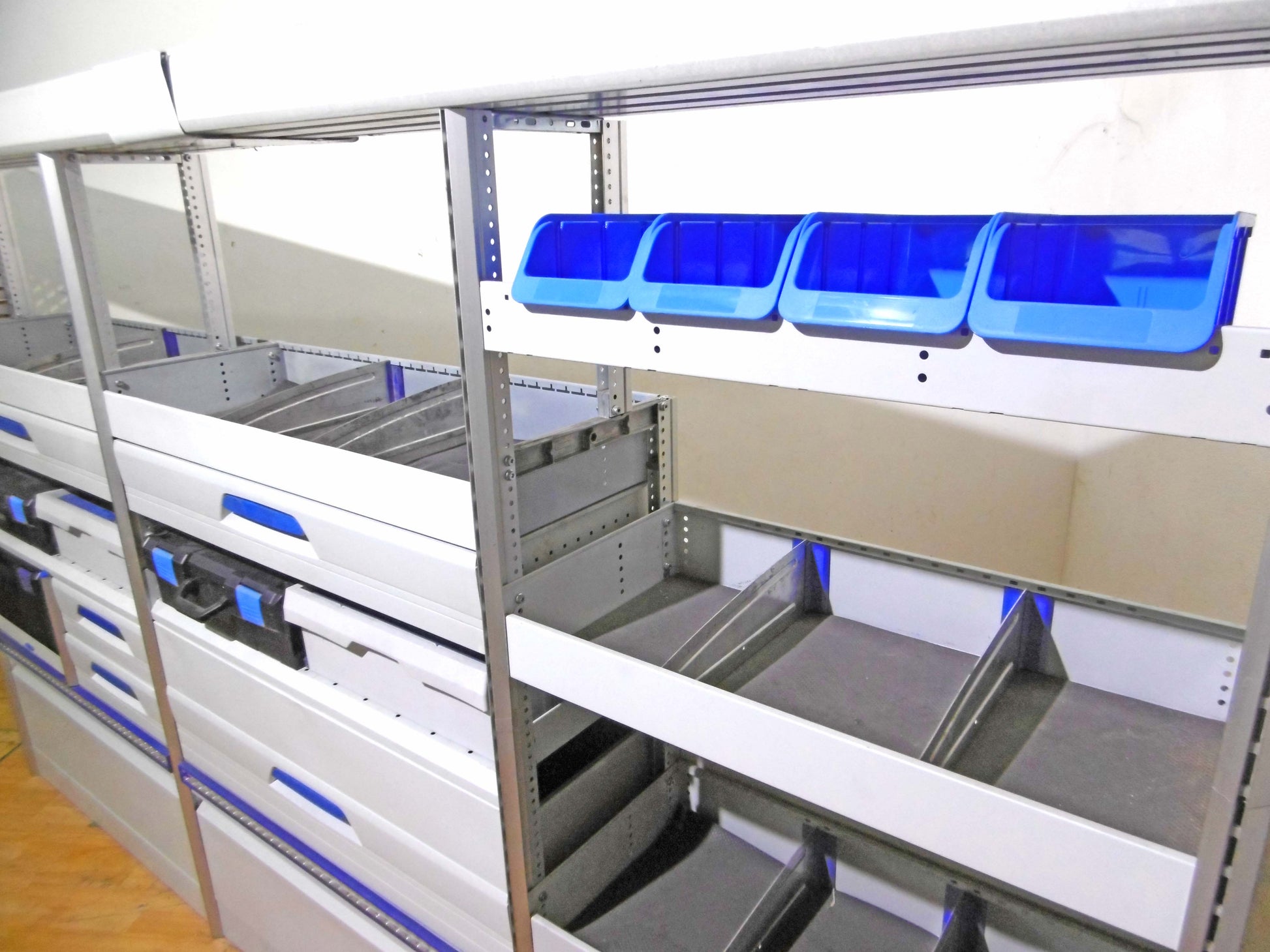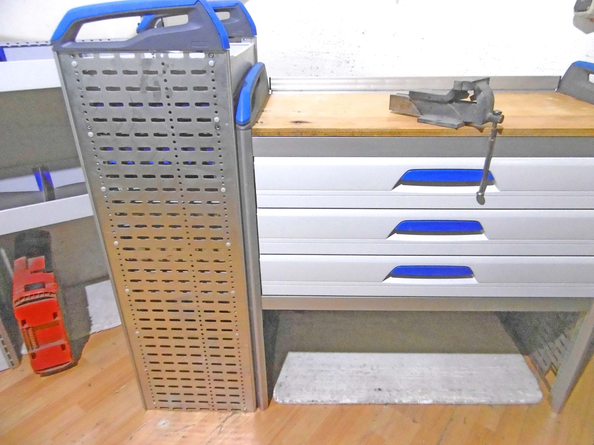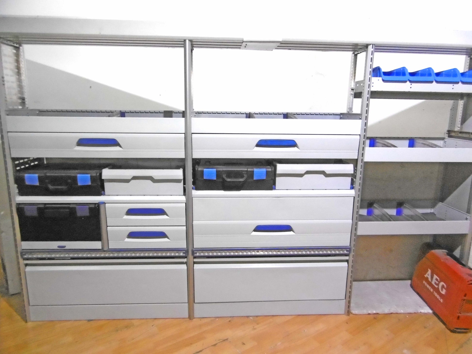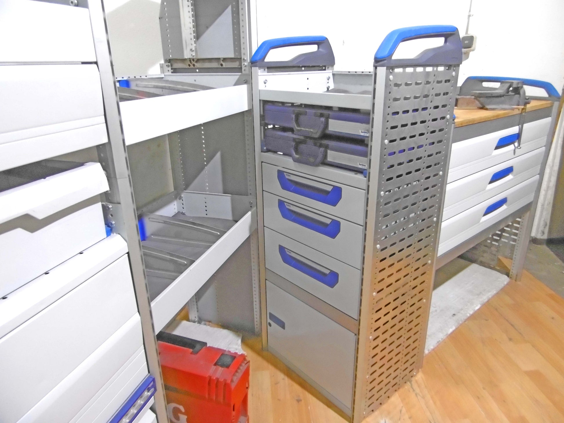 Bild 1 (rehte Seite): 6 x Schübe 3 davon bequem von der Schiebtür erreichbar), 2 x herausnehmbare Koffer, Werkbank ohne Schraubstock, unten offen
