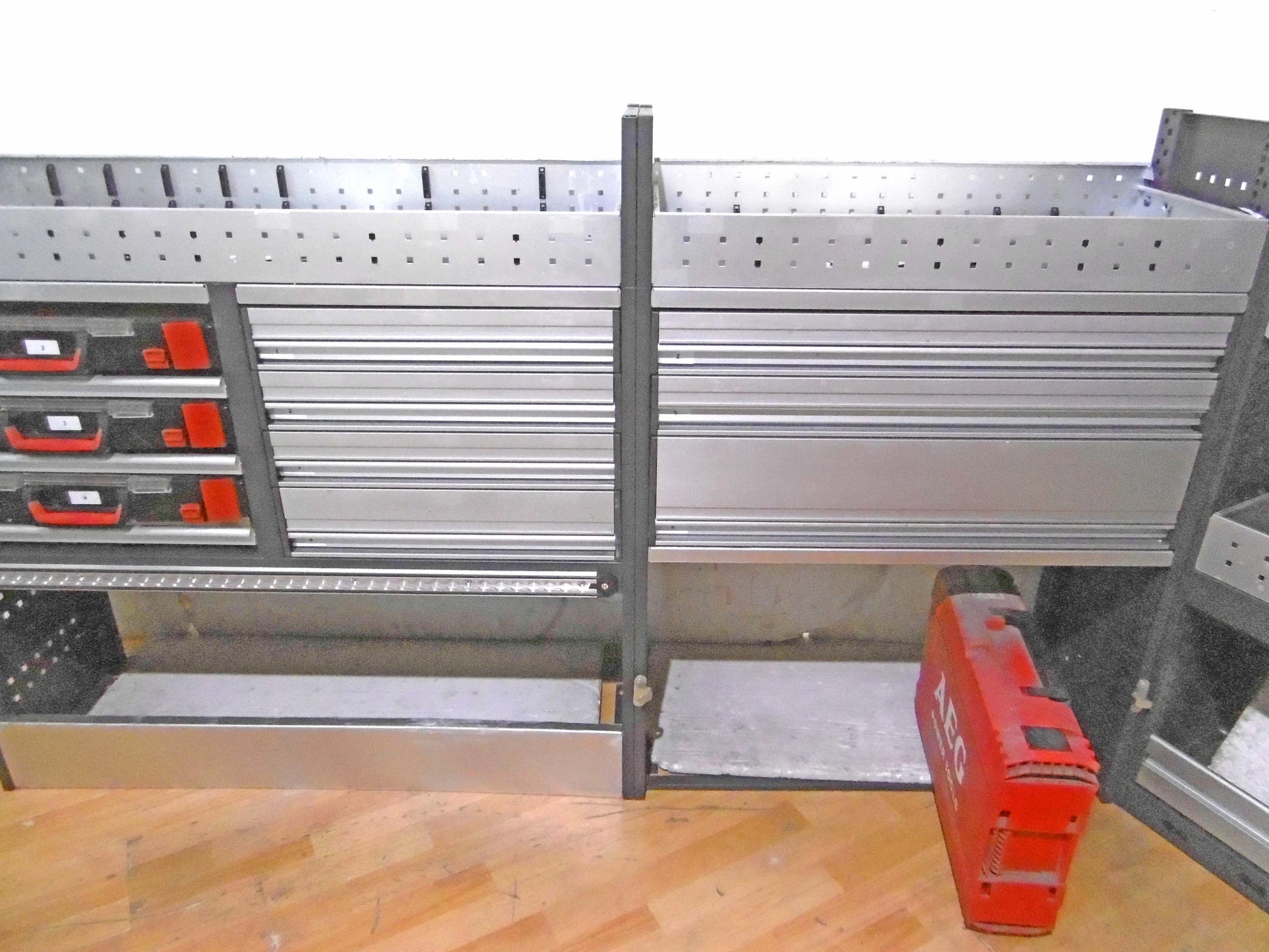 - Bild 1 (linke Seite): 4 x Schübe, 3 x herausnehmbare Koffer div. Ablage-Ebenen/Trennbleche, unten Klappe bzw. offen