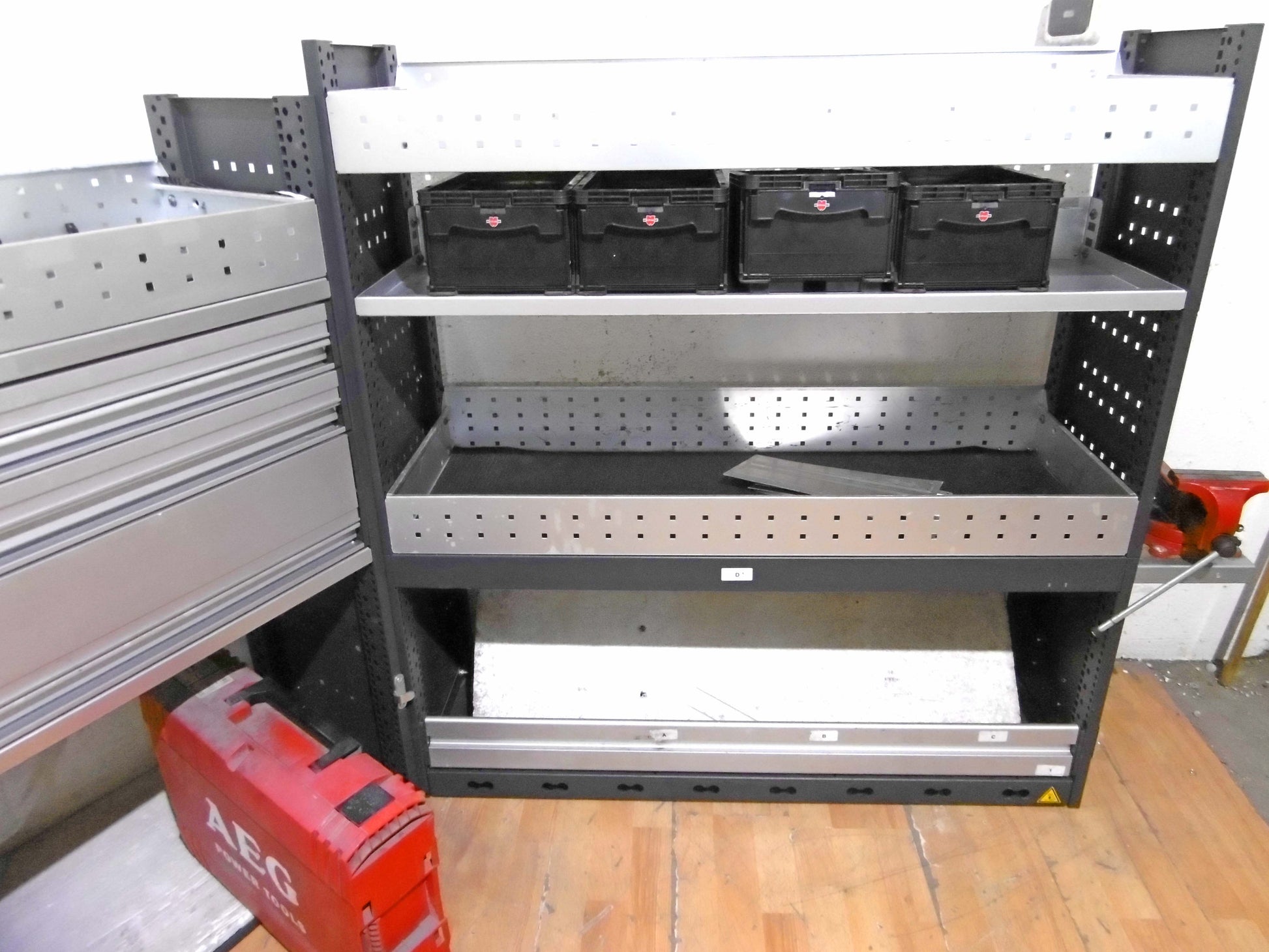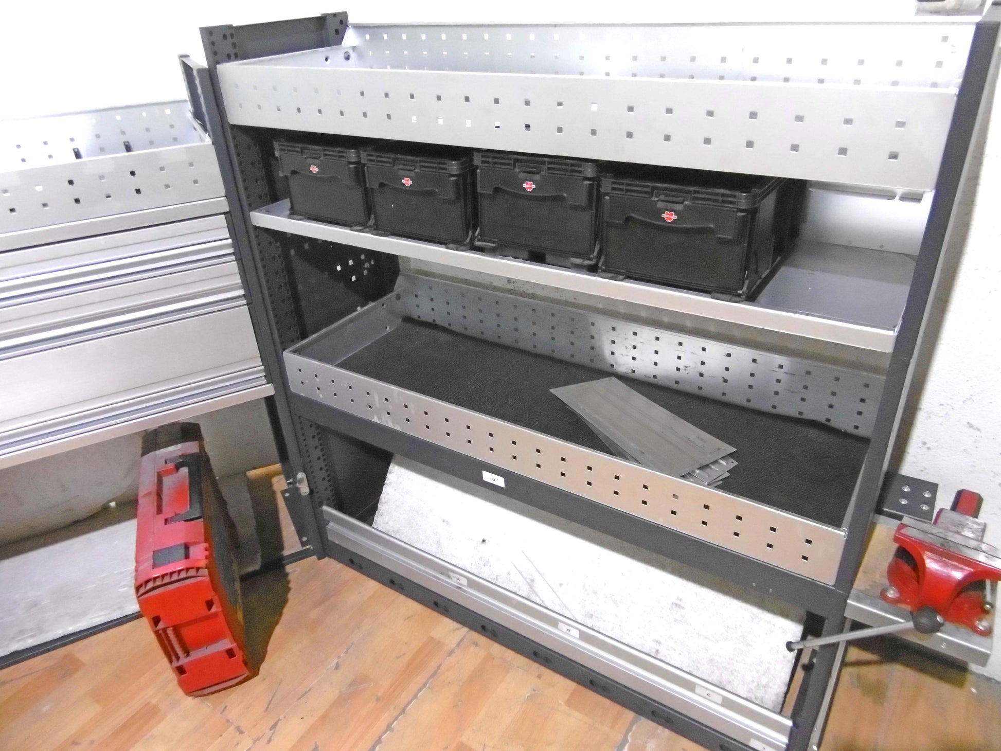 - Bild 1 (rechte Seite): viele Ablage-Ebenen, div. Sortierboxen, heruasziehbare Werkbank mit Schraubstock, unten offen